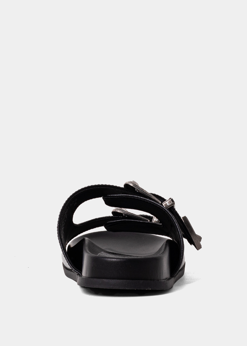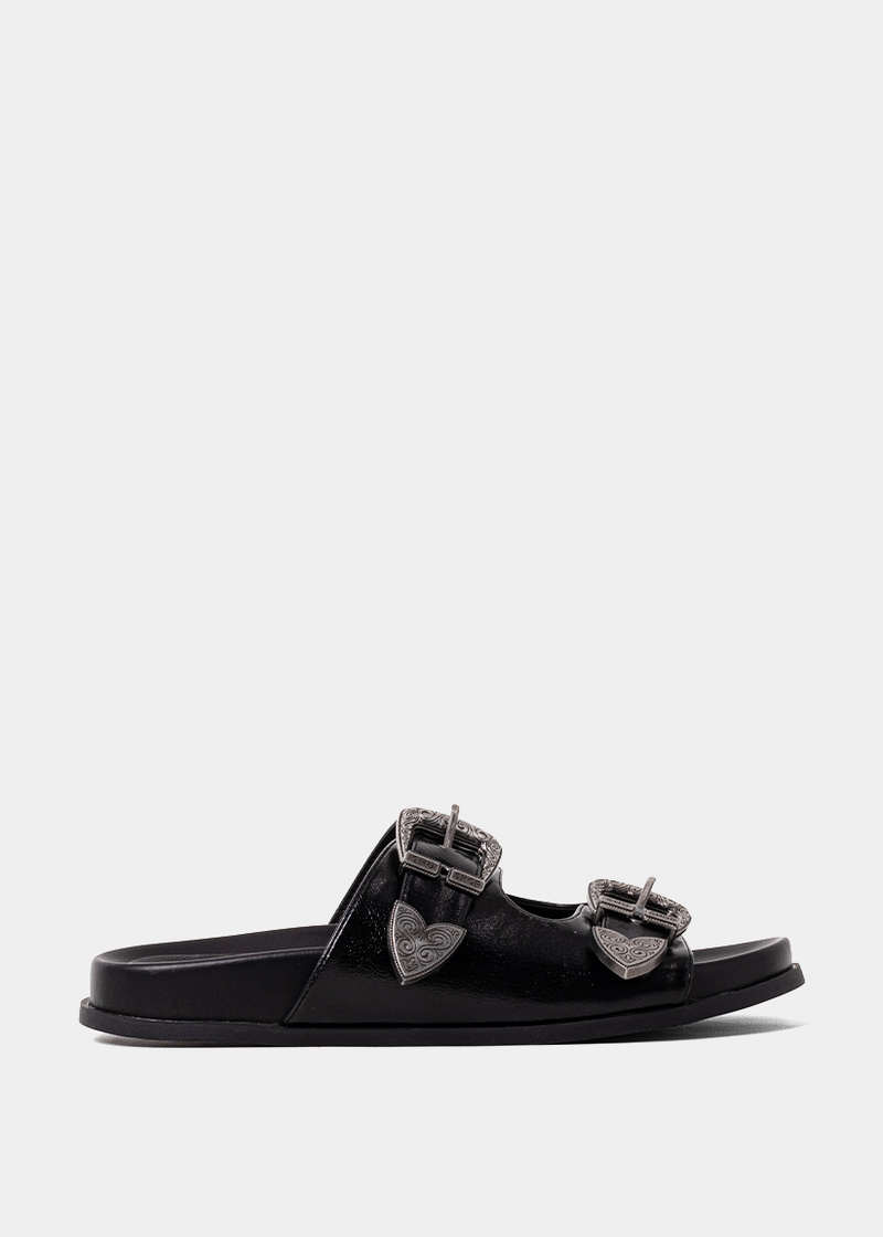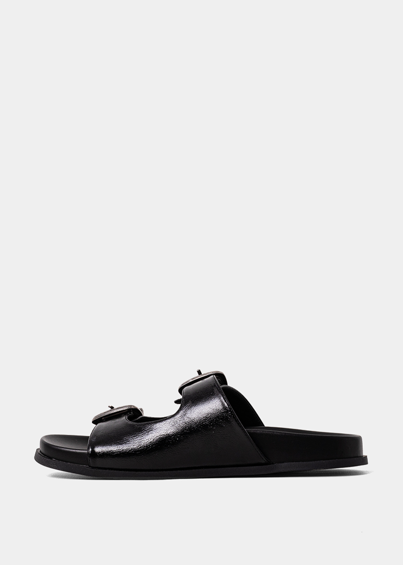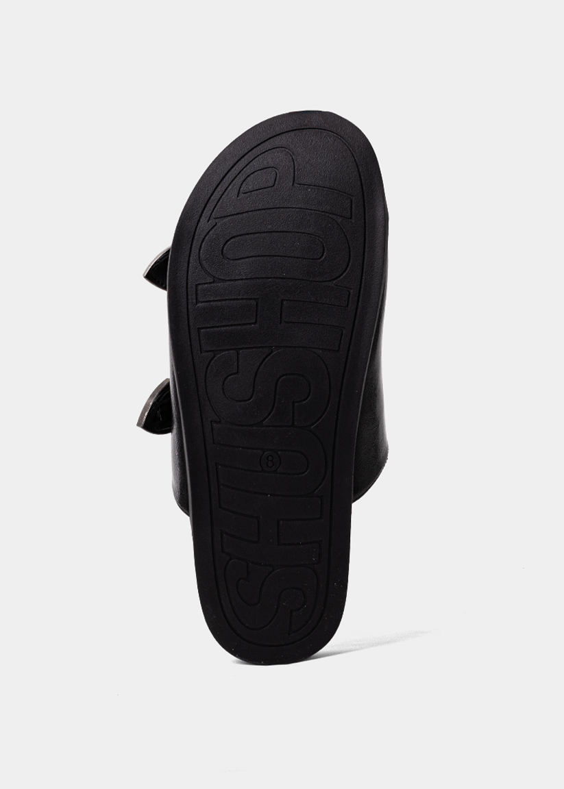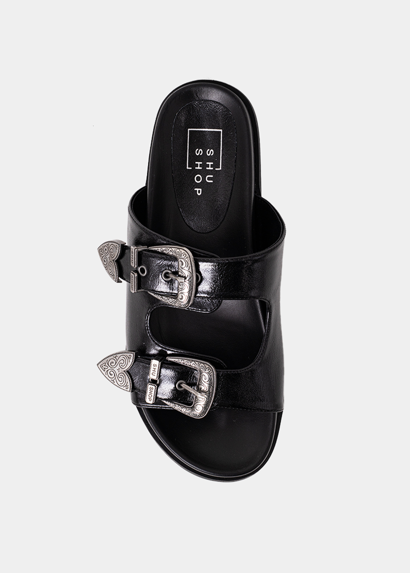 DOLLY in Black is your go-to for making a subtle statement. The patent-inspired shine pairs beautifully with the sculpted heart-shaped buckles, giving this easy sandal a dramatic flair. Wear it with flowy sets or structured tailoring. It'll ground your look with cool contrast.