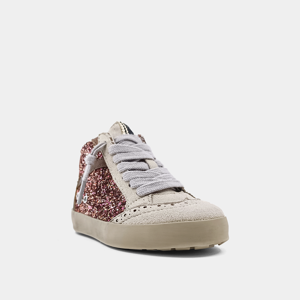 Our Riley hi-top sneakers offer a contemporary take on traditional athletic footwear. They come in updated colors and textures, such as high-quality faux leather and glittery embellishments. You can pair them with your favorite denim to create a fashionable and comfortable outfit. Here's the mini version available for your little one in our Mommy and Me collection