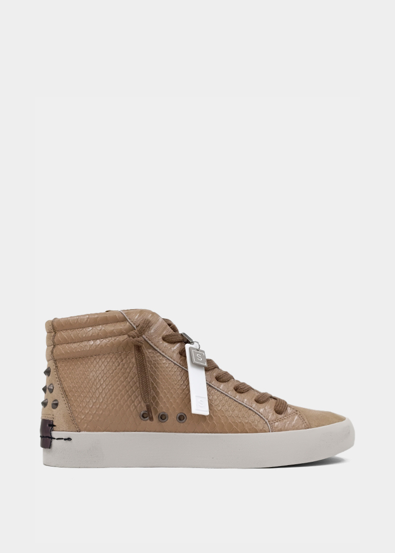 Introducing REESE - our new favorite high-top sneaker. Crafted from high-quality faux leather and suede, with a modern all taupe snake-like texture, distressed patches, and studs for a unique twist. The rubber soles offer long-lasting comfort and support, perfect for all-day wear. Pair them with trousers or a skirt for a modern look. These sneakers boast timeless appeal and superior craftsmanship, complete with a modern pendant tag showcasing the brand icon.