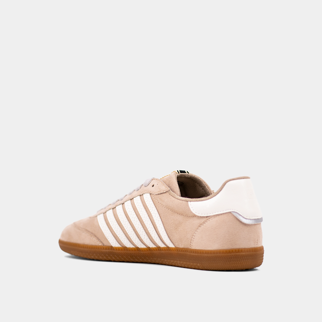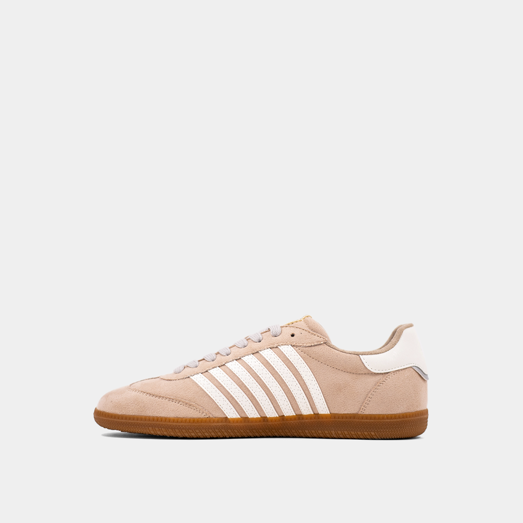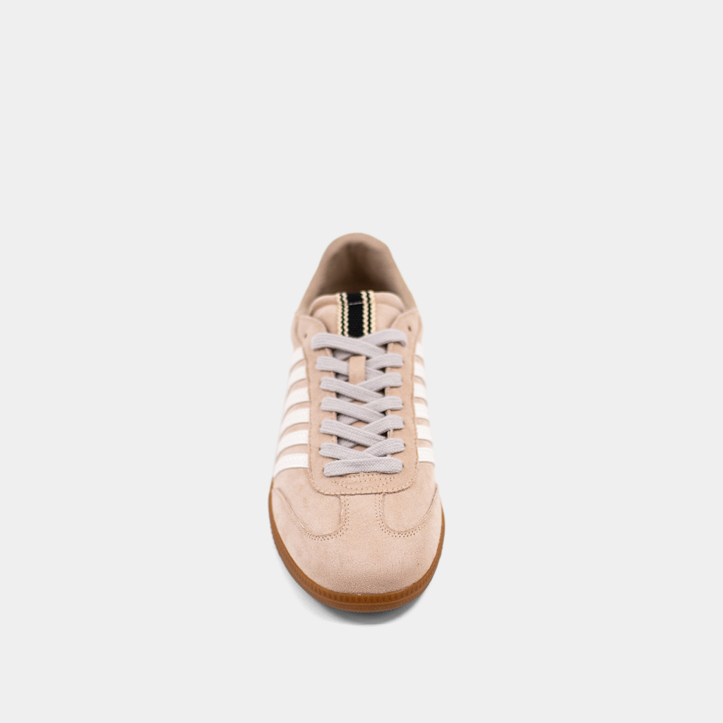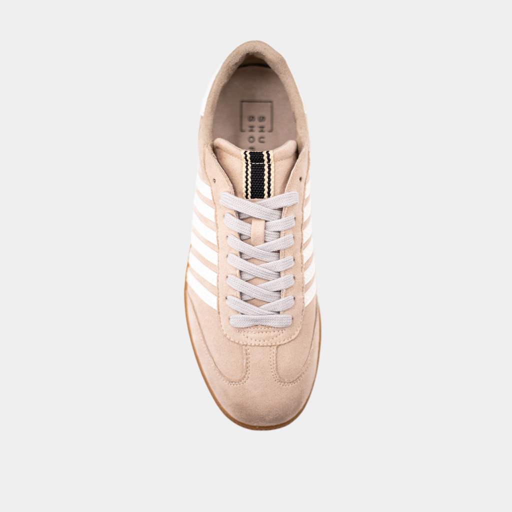 Step up your game with STEVIE in Beige Suede! This retro-inspired sneaker redefines cool, featuring crisp white stripes and a matching heel accent. Crafted with luxe suede body and faux leather accents and finished with a gum sole, it's the perfect mix of style and comfort. Ready to own the spotlight?