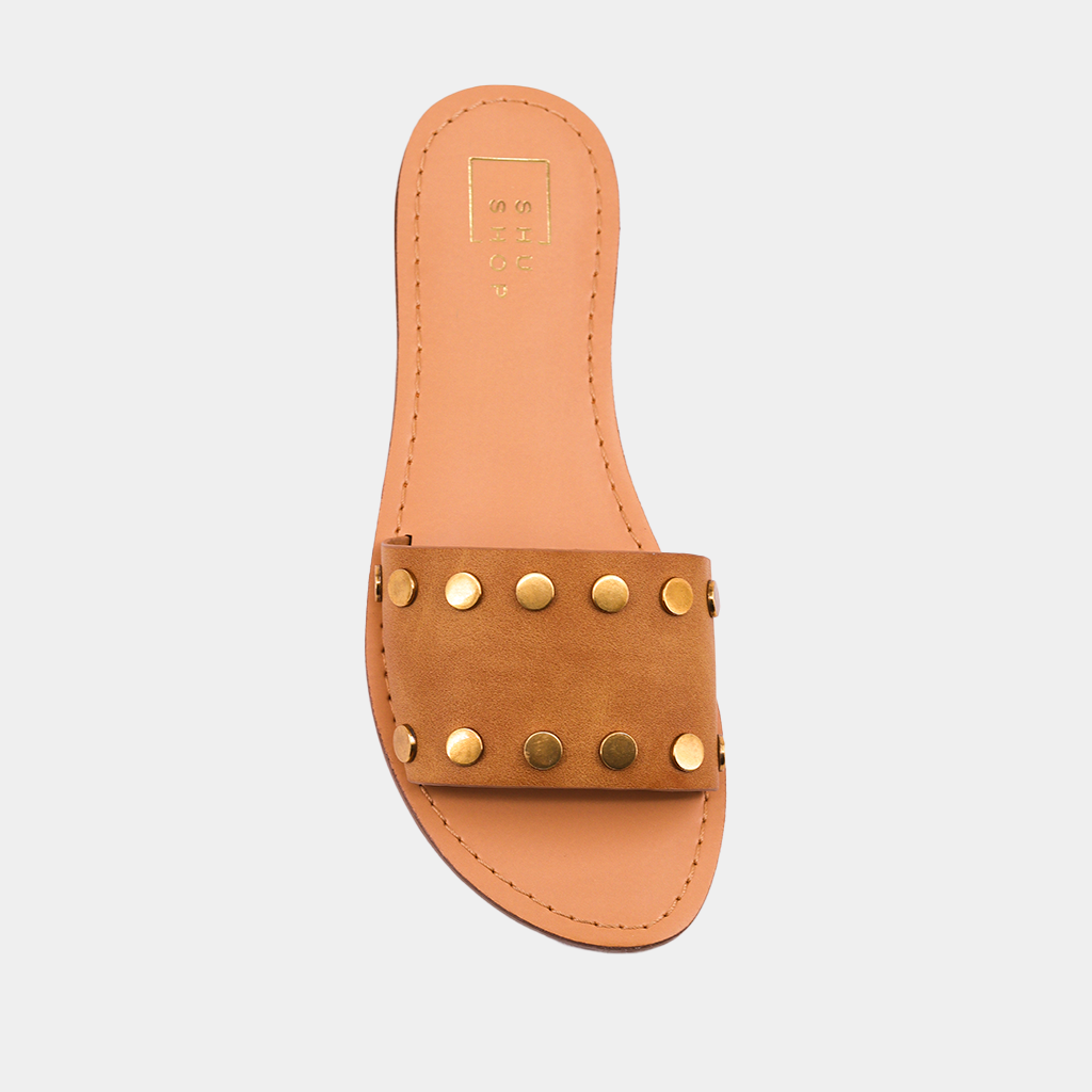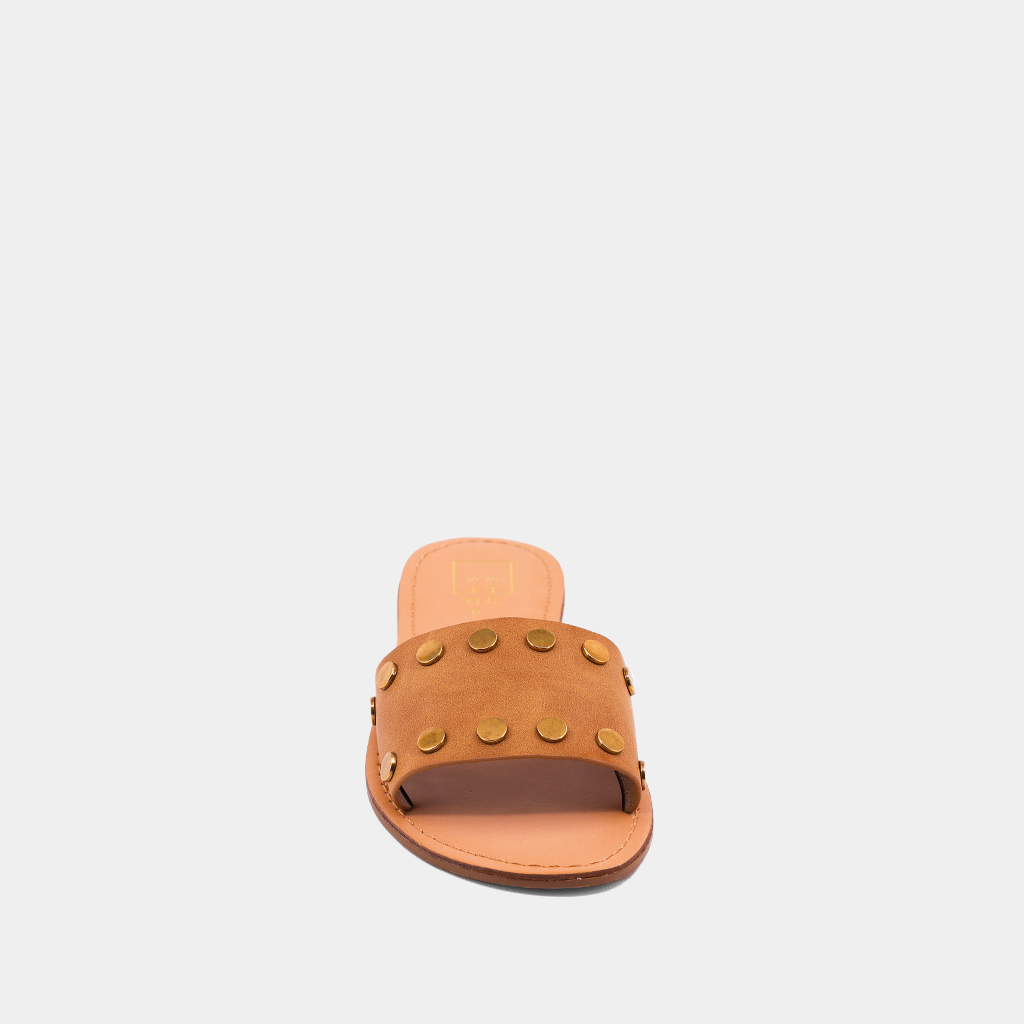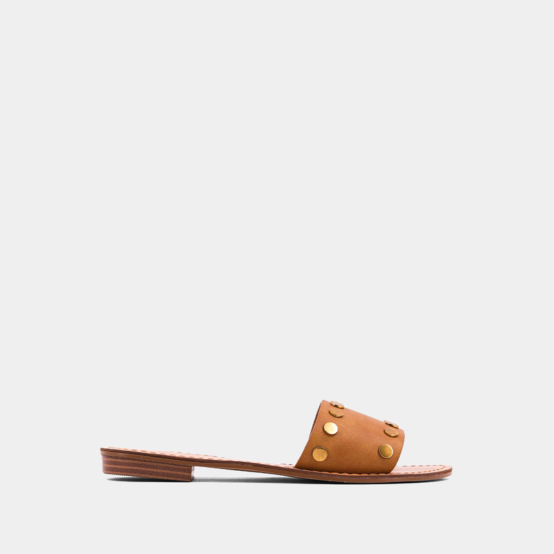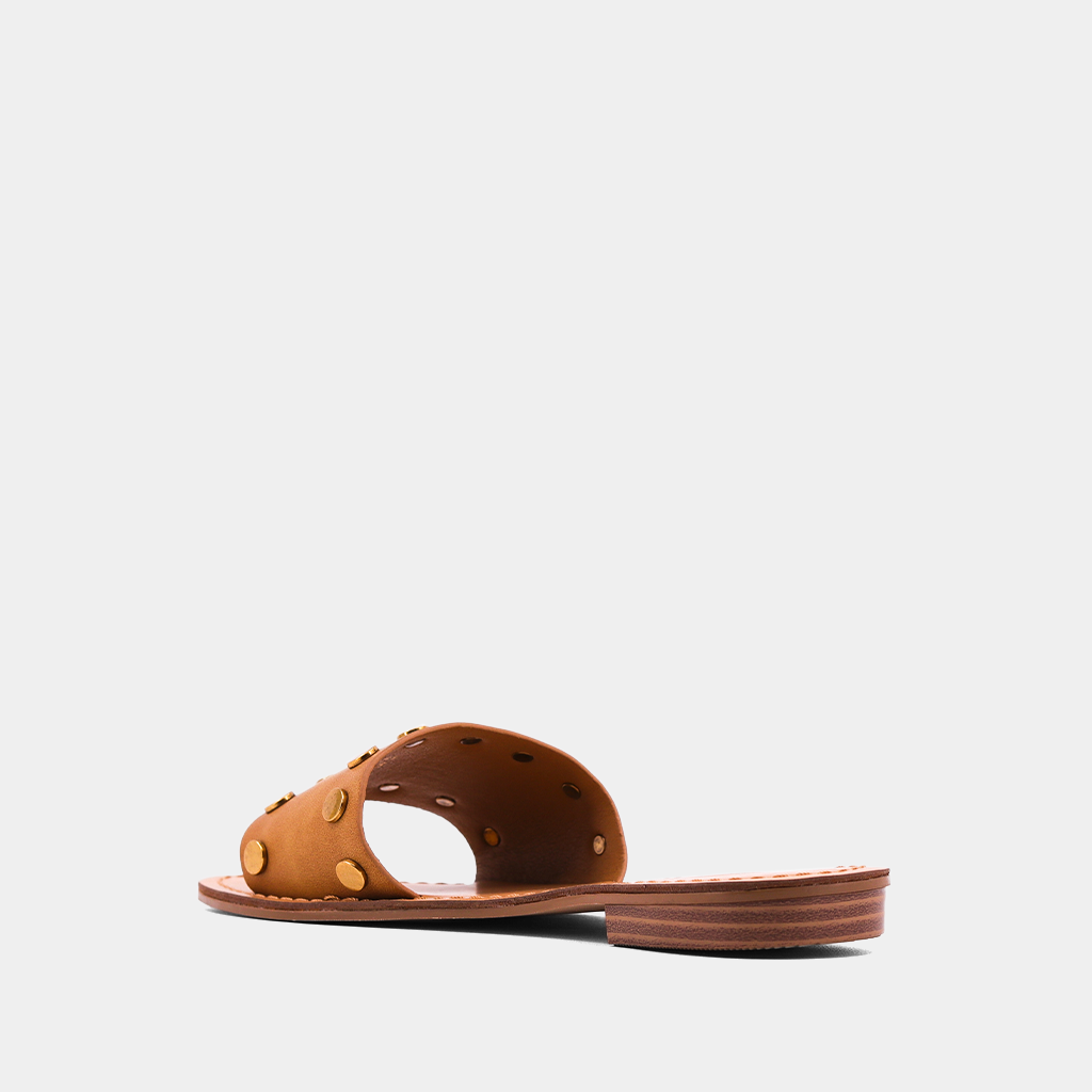 Classic with a hint of attitude, the BERNADETTE in Camel is a must-have for those who love warm, earthy tones. Made from supple faux leather, the rich caramel hue is complemented by gleaming gold studs, giving it a luxe, bohemian feel. Slip them on with linen pants or denim for a chic, effortless vibe.