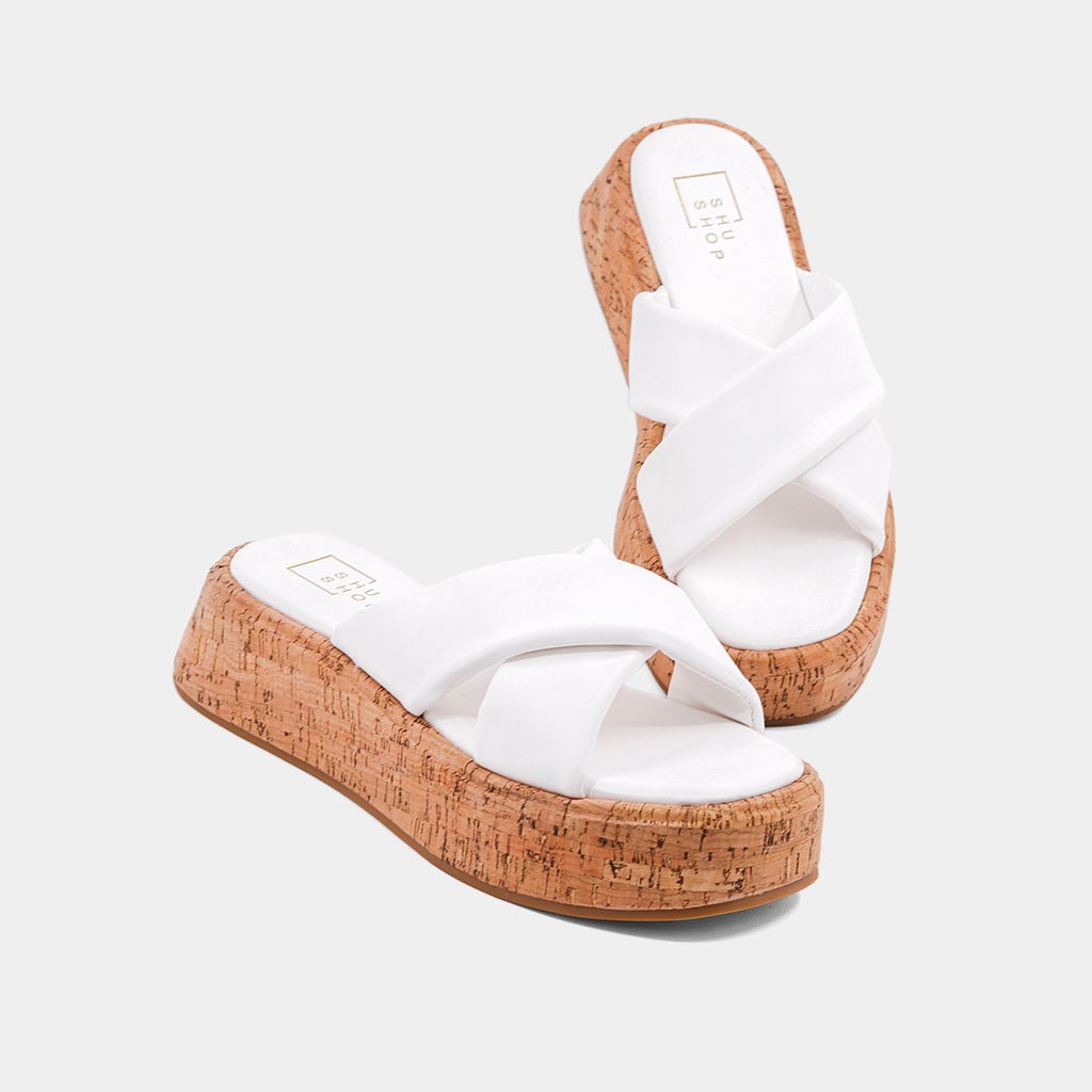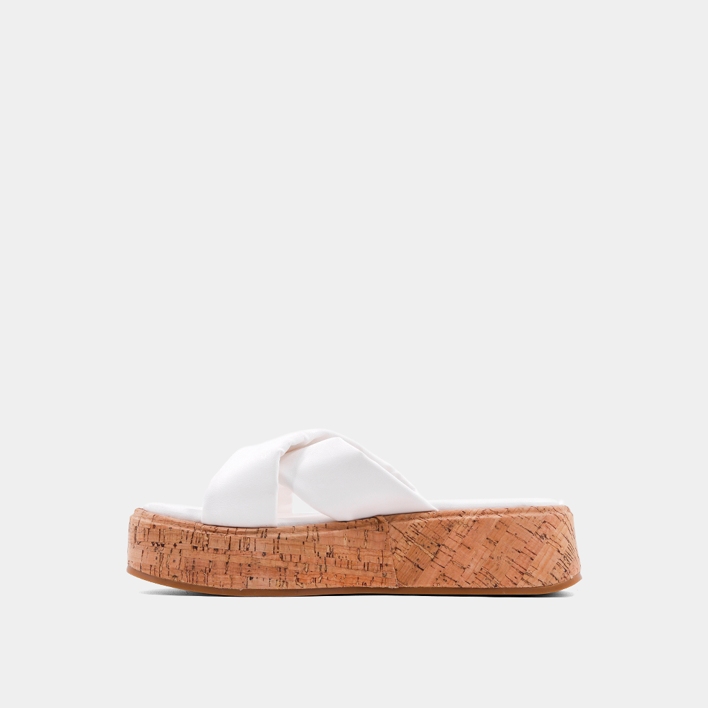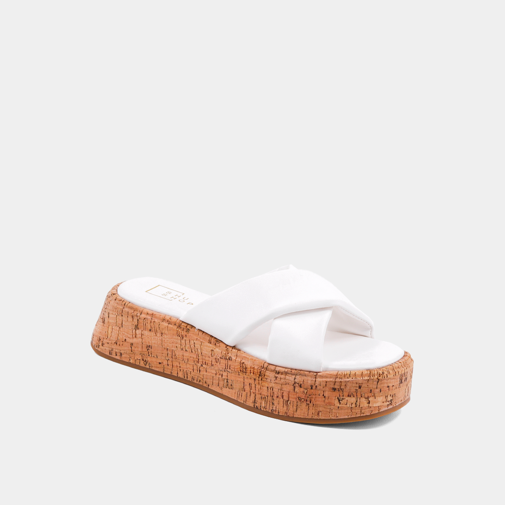 Fresh, clean, and stylish, the LYDIA in white is your go-to summer sandal wedge. The smooth faux leather straps contrast beautifully with the cork platform sole, giving you an effortlessly elevated look. Perfect for pairing with breezy linen outfits or your favorite denim.