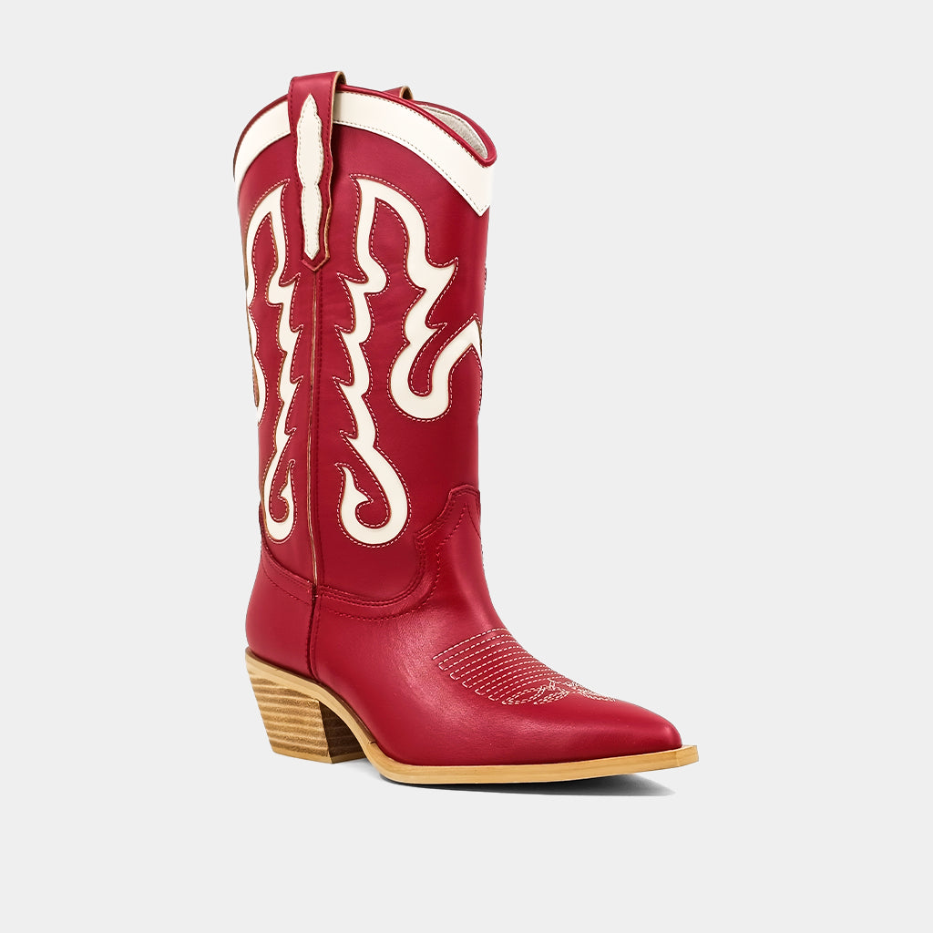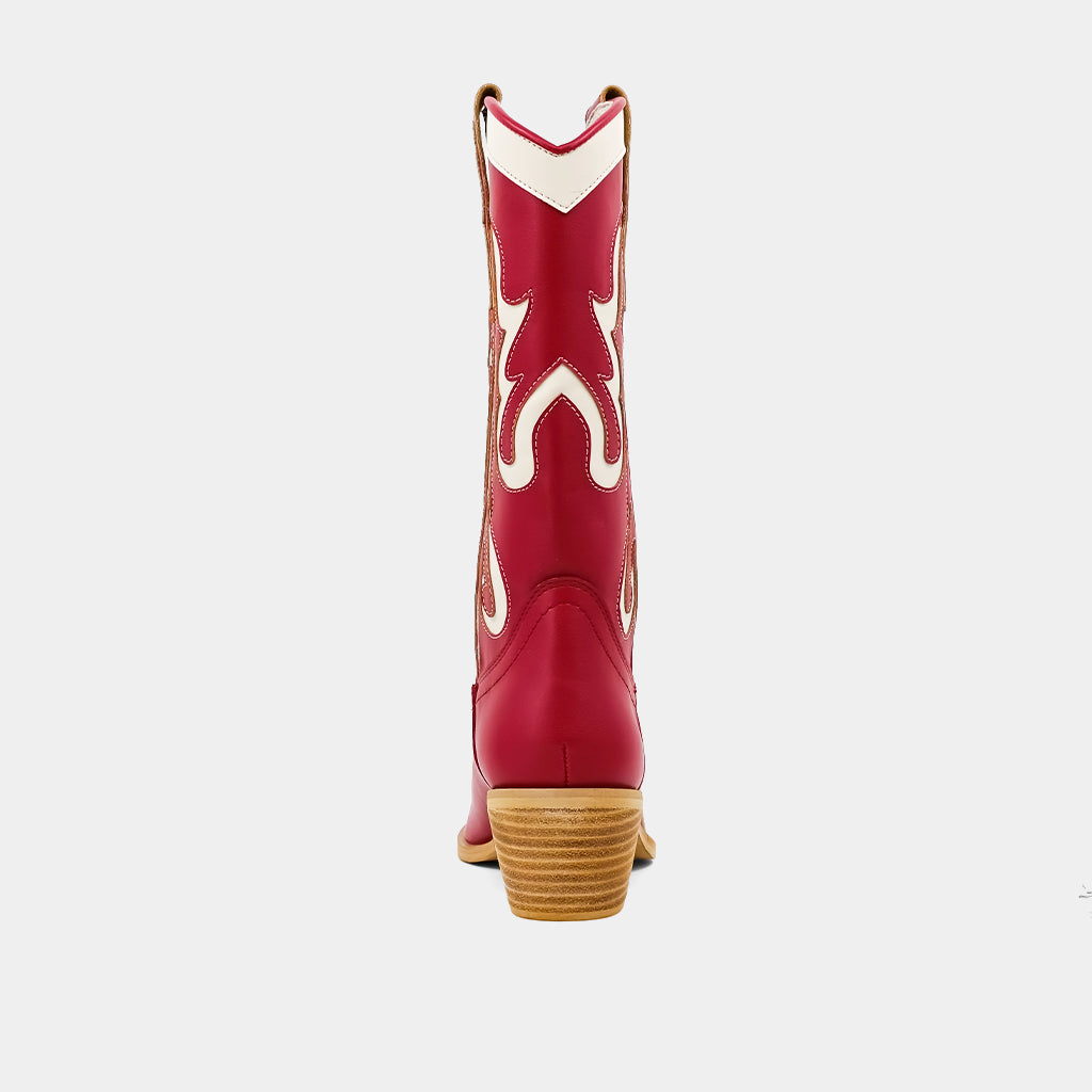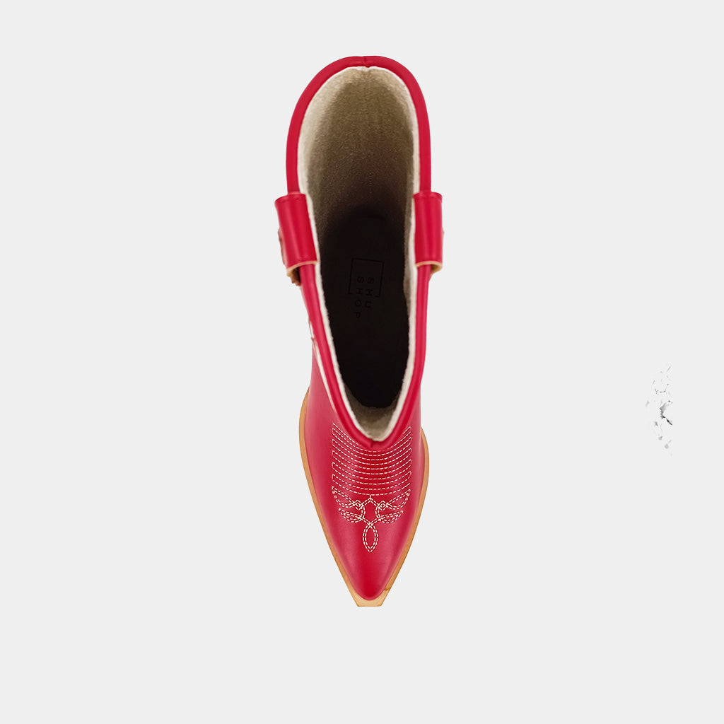 Step into style with our faux leather cowboy boots. These boots feature bold, intricate embroidery on a crisp, shiny red background, making them a true fashion statement. The stacked heel offers just the right lift for all-day comfort. Perfect for any occasion simply slip them on and step out with confidence!