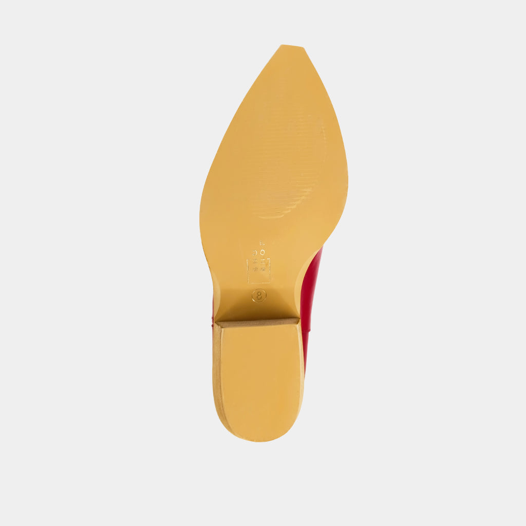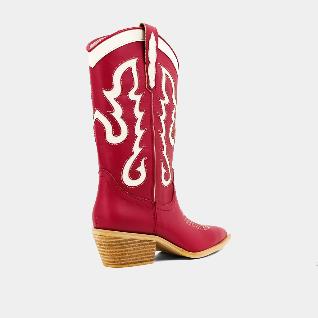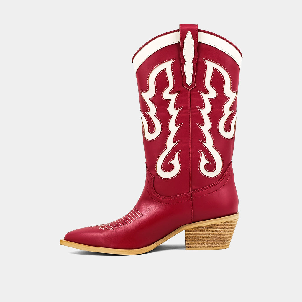 Step into style with our faux leather cowboy boots. These boots feature bold, intricate embroidery on a crisp, shiny red background, making them a true fashion statement. The stacked heel offers just the right lift for all-day comfort. Perfect for any occasion simply slip them on and step out with confidence!