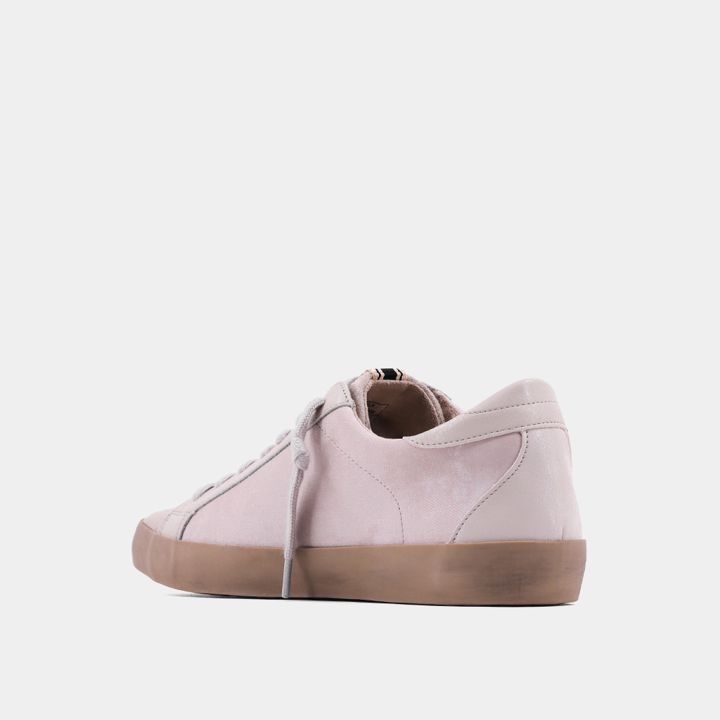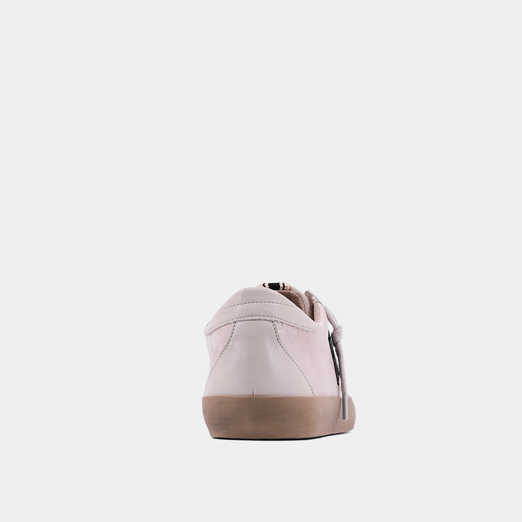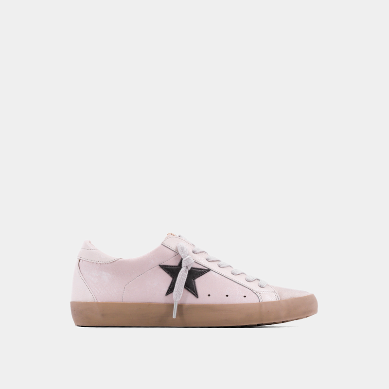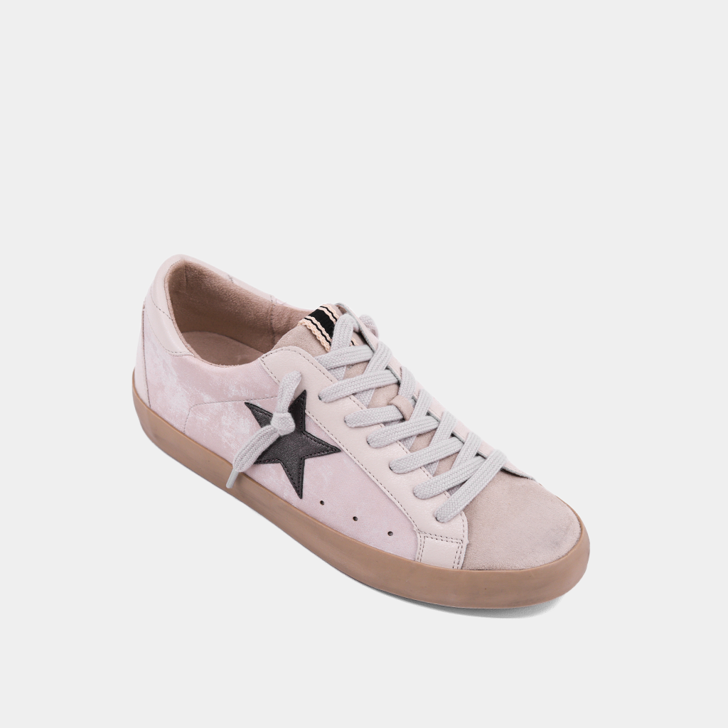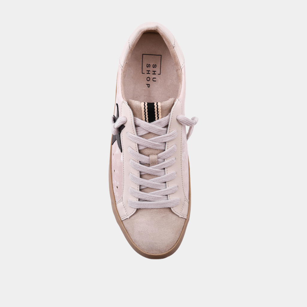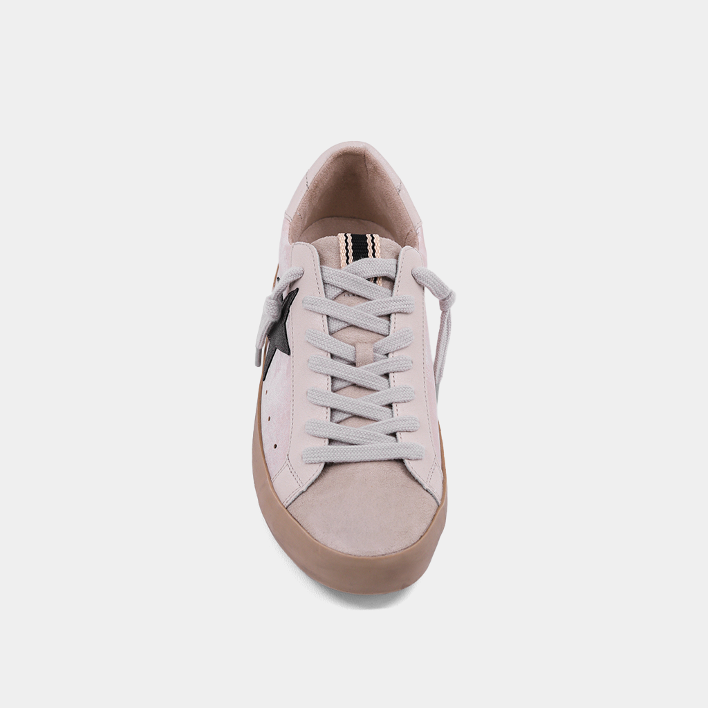 Soft, effortless, and undeniably chic the PAULA Blush Denim is your new go-to sneaker for casual cool. Designed with a washed blush denim upper, this pair brings a vintage-inspired touch with a textured taupe leather star and off-white faux leather heel tab. The distressed rubber sole gives it that perfectly broken-in look, while the faux suede toe cap adds an elevated contrast. Whether you're dressing up or down, this sneaker delivers style with every step.