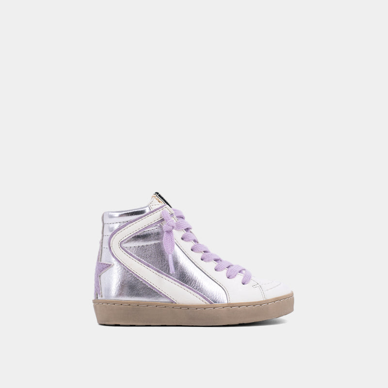 Step up your little one's style with the ROONEY MINI high-tops in Lilac Snake! The metallic silver faux leather body is paired with lilac accents for a playful twist. Perfect for both Kids and Toddlers, these sneakers offer comfort with a sturdy sole and rounded toe. Toddlers' sizes feature a zipper for easy slip-on wear, making them both stylish and practical!