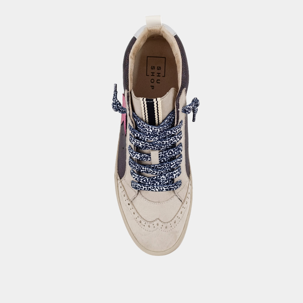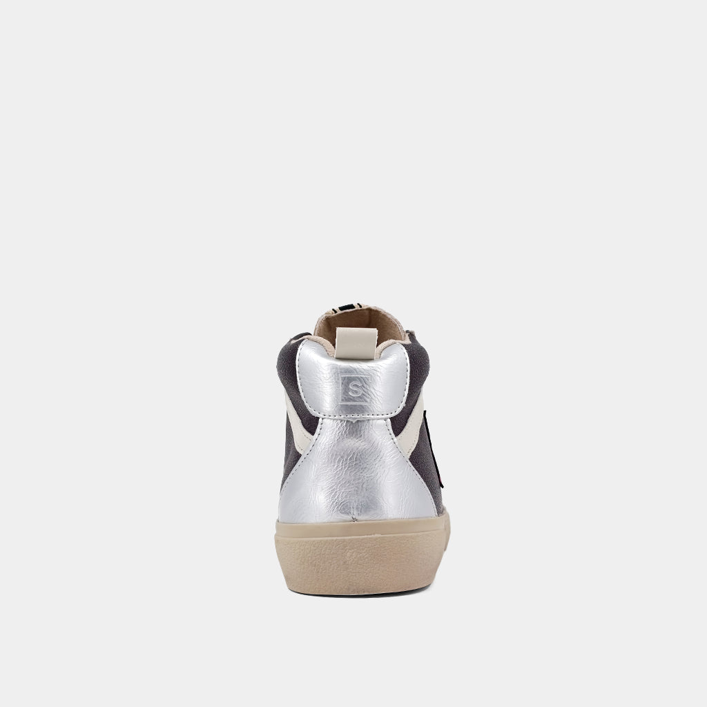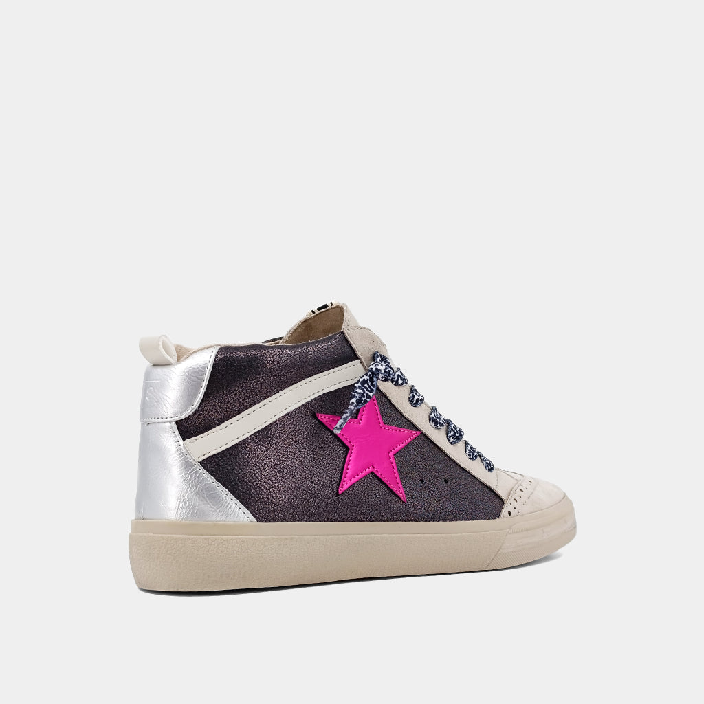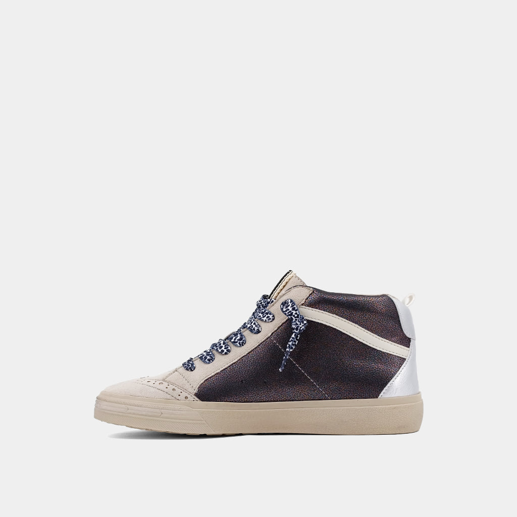 Discover the stylish and modern PAULINA high-top sneakers that bring a fresh twist to the classic basketball shoe design. These sneakers feature a unique combination of colors and textures, including a metallic body crafted from faux leather and suede embellishments. With a durable rubber sole, these sneakers not only provide comfort but also add a touch of sophistication to any outfit.