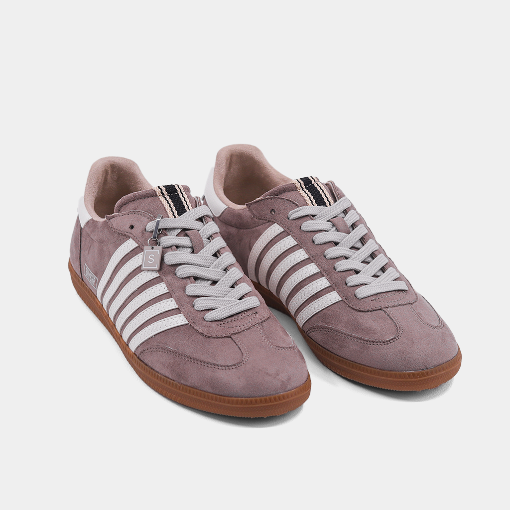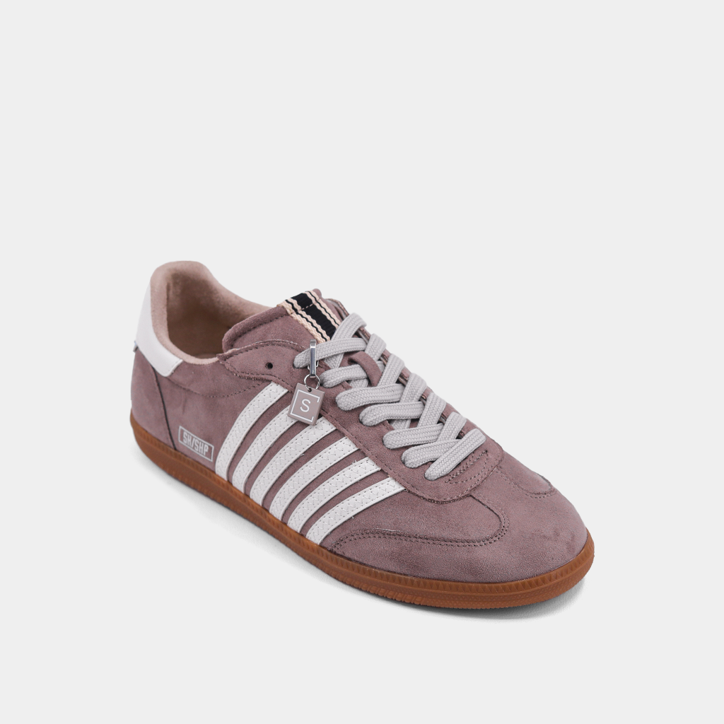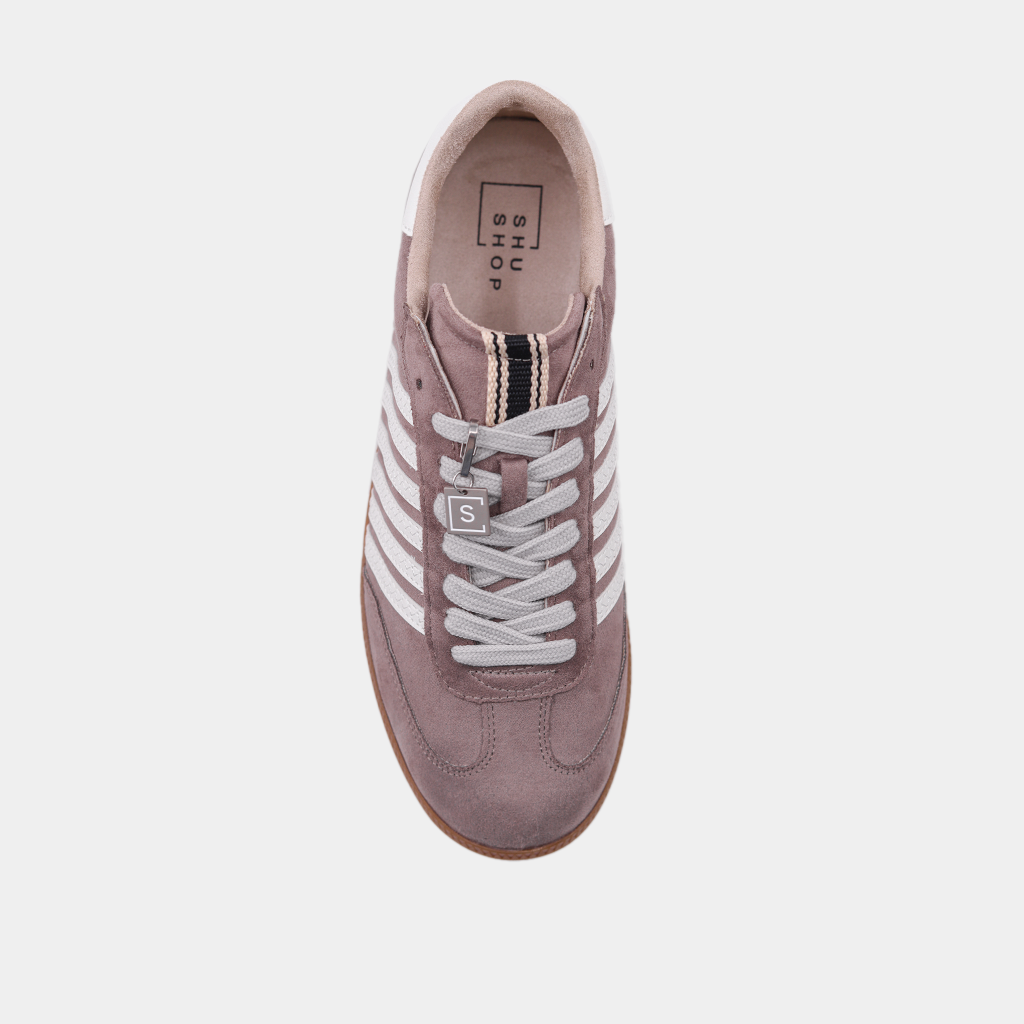 A modern nod to vintage sports styles, the STEVIE in Taupe Suede is built with soft faux suede and features crisp white stitched stripes for a bold, structured look. Finished with a contrast heel tab and a gum rubber sole, it's an easy statement-maker for everyday outfits.