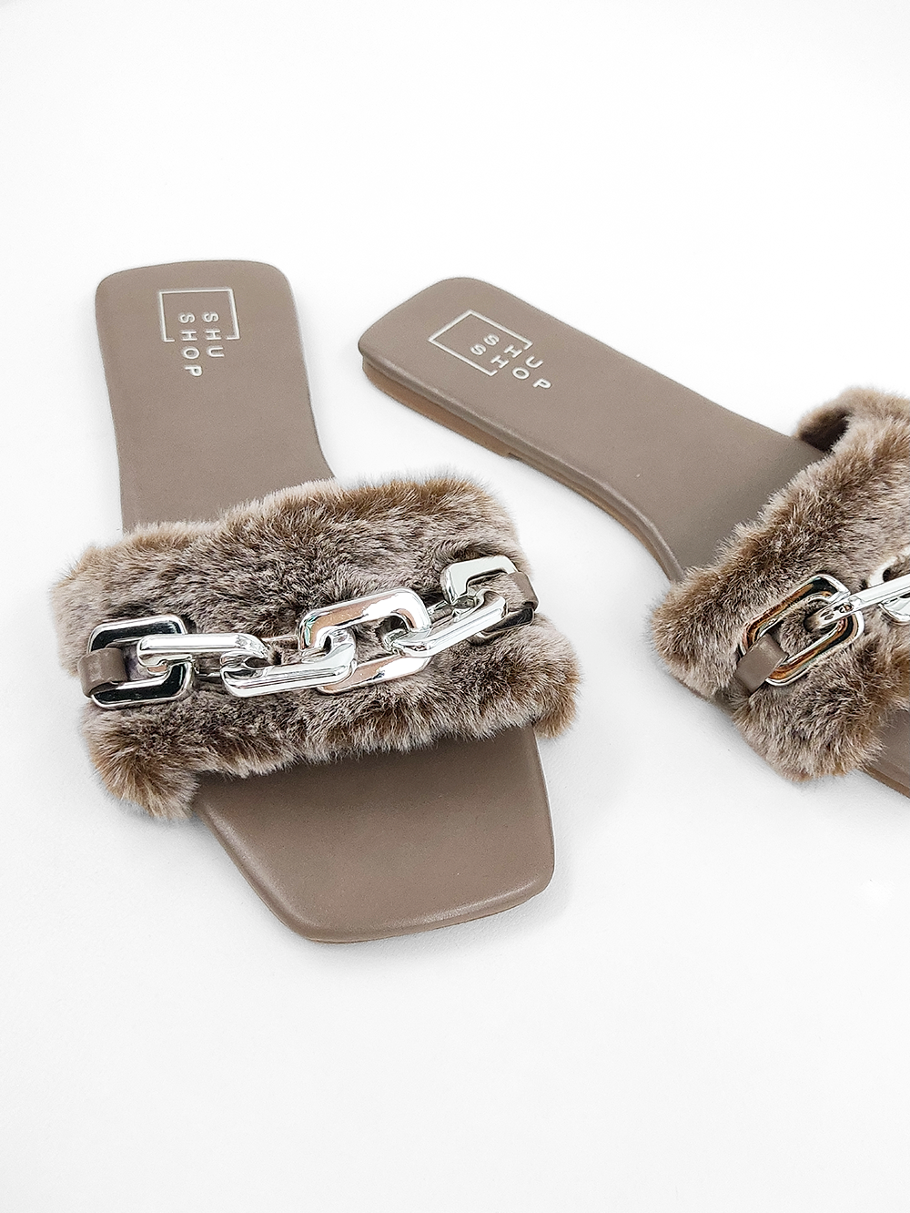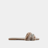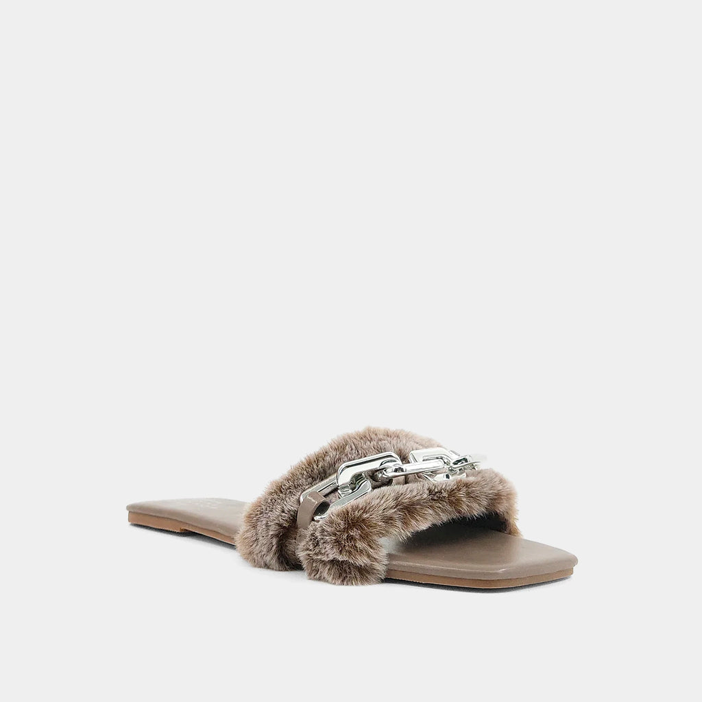 Give your sandals a cozy update with our BERLIN slides. These slip-on sandals feature a plush faux fur upper and metallic chain detail. Wear yours with jeans or short dresses.