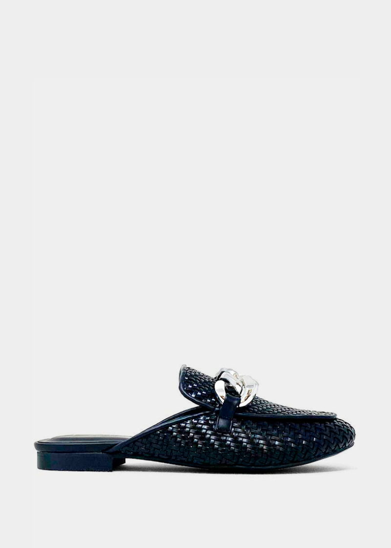 Elevate your look with the ALEXIS hybrid loafer-mule where effortless style meets versatility. Crafted from intricately woven faux leather in sleek black, this standout piece is adorned with a bold silver chain for a touch of modern edge. Whether you're headed to a business meeting or a weekend brunch, ALEXIS transitions seamlessly from day to night, pairing perfectly with everything from sharp tailoring to laid-back denim.