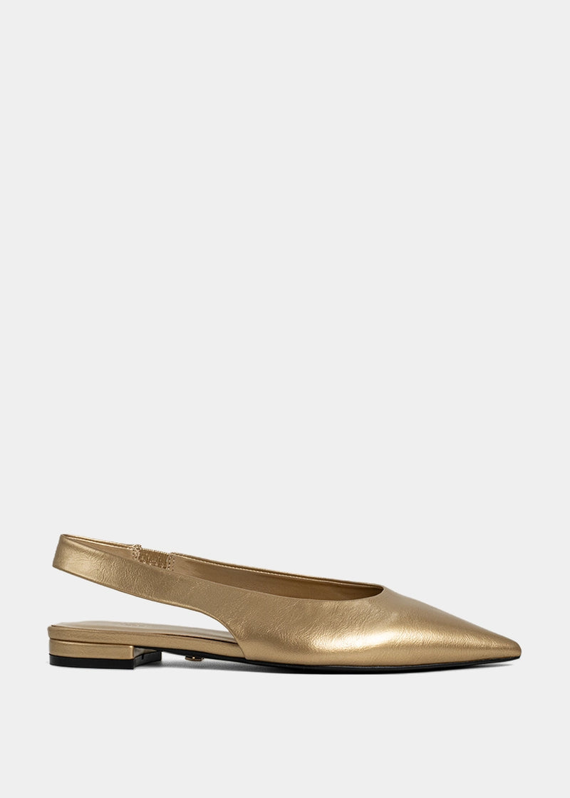 Chic, polished, and just the right amount of glam. The Amelia Gold slingback flat elevates your everyday look with its sleek pointed toe and lustrous gold finish. Whether you're heading to the office, brunch, or a night out, this shoe brings instant sophistication-with all-day comfort.