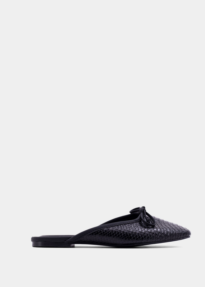 Edgy yet timeless, the ANDREA in Black Snake makes a statement with its bold, textured faux snake leather. The pointed toe and dainty bow create an elegant balance, making this flat as versatile as it is striking. Slip it on for an effortlessly refined look that takes you from desk to dinner with ease.