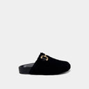 Introducing AZALEA: the epitome of fashionable slippers that exude a trendy clogs vibe. With a branded molded footbed, a comfortable round toe, an open-back slip-on style, and a durable flat rubber sole, they are crafted from a luxurious combination of textiles, faux leather, suede, and lambskin. The versatile design, complemented by a metal chain detail, makes them the perfect complement to jeans or skirts, adding a touch of comfort and style to any outfit.