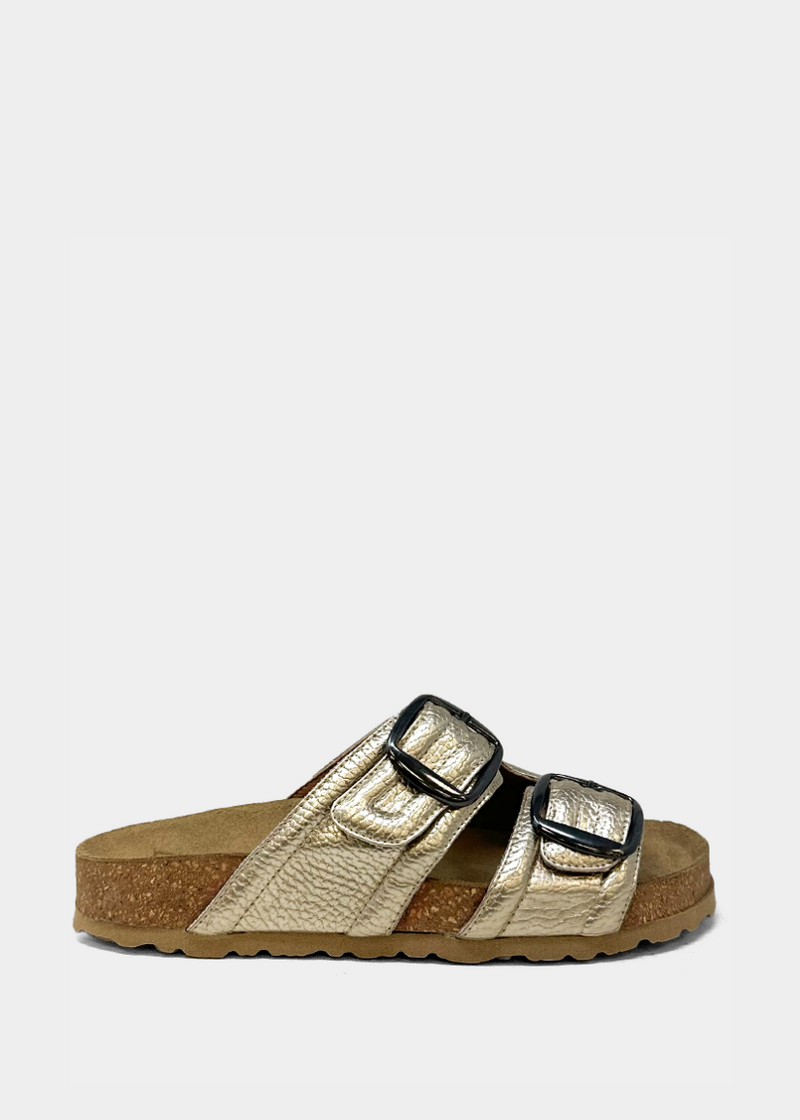 Go for gold literally. The BARBARA in metallic gold is made to turn heads, crafted in Italy from premium leather with a radiant finish. The oversized gold-tone buckles amplify the luxe appeal, while the sculpted footbed and cork sole provide the perfect balance of fashion and function. Because confidence starts from the ground up.