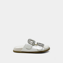 Our BRIDGET slip-on sandals are crafted from super soft faux leather. This pair feature a comfortable molded footbed and is crowned by two buckle ornaments embellished with crystals. Make sure to pack these for your next weekend getaway.