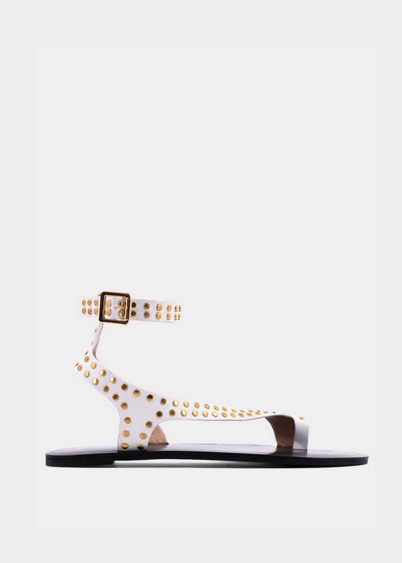 Chic and striking, the CARRIE sandal in White redefines modern elegance with a rock-glam edge. Featuring a sleek faux leather finish and gold-tone stud embellishments, this flat sandal brings effortless style to any look. The structured straps, adjustable ankle buckle, and secure toe loop provide both fashion and function. Pair it with everything from summer whites to monochrome fits for a statement-making stride.