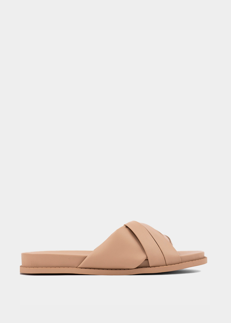 Slip into the CHELSEA in Nude for chic, minimalist style. Crafted from soft faux-leather with a sleek crisscross design, this sandal offers cushioned comfort and versatile wear for any warm-weather look.