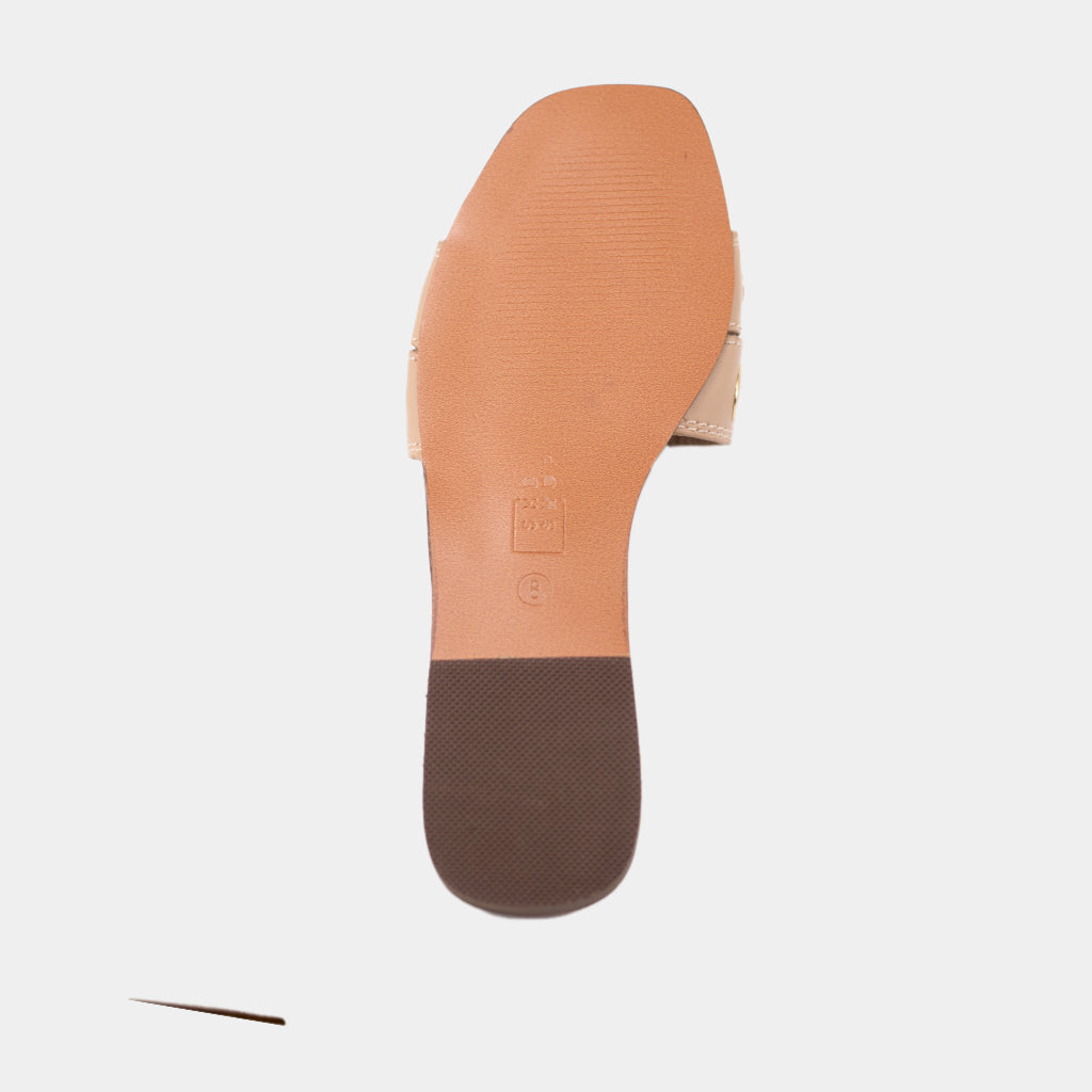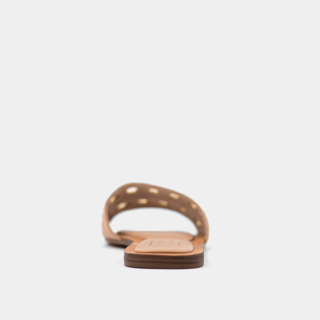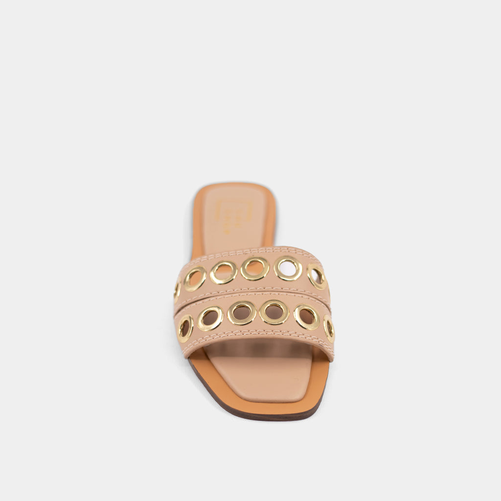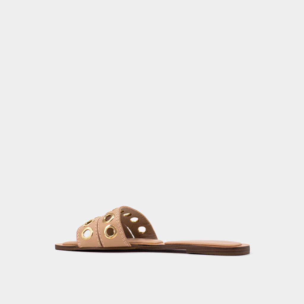 The CODIE flat sandal in Nude is your go-to for versatile, chic style. Crafted with smooth faux-leather in a soft nude tone and highlighted by bold oversized gold eyelets, this sandal adds just the right amount of edge to any outfit. The padded insole offers all-day comfort, making it perfect for everything from brunch dates to evening strolls. Pair CODIE with your favorite spring looks for a polished finish.
