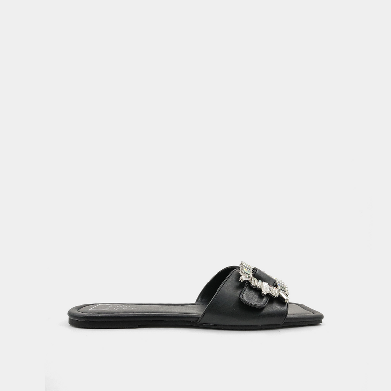Slip into CONSUELO's easy style with slouchy jeans or breezy dresses. This sandal is crafted from faux leather and is topped with a stunning crystal-embellished buckle.
