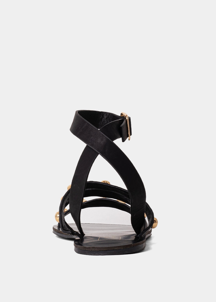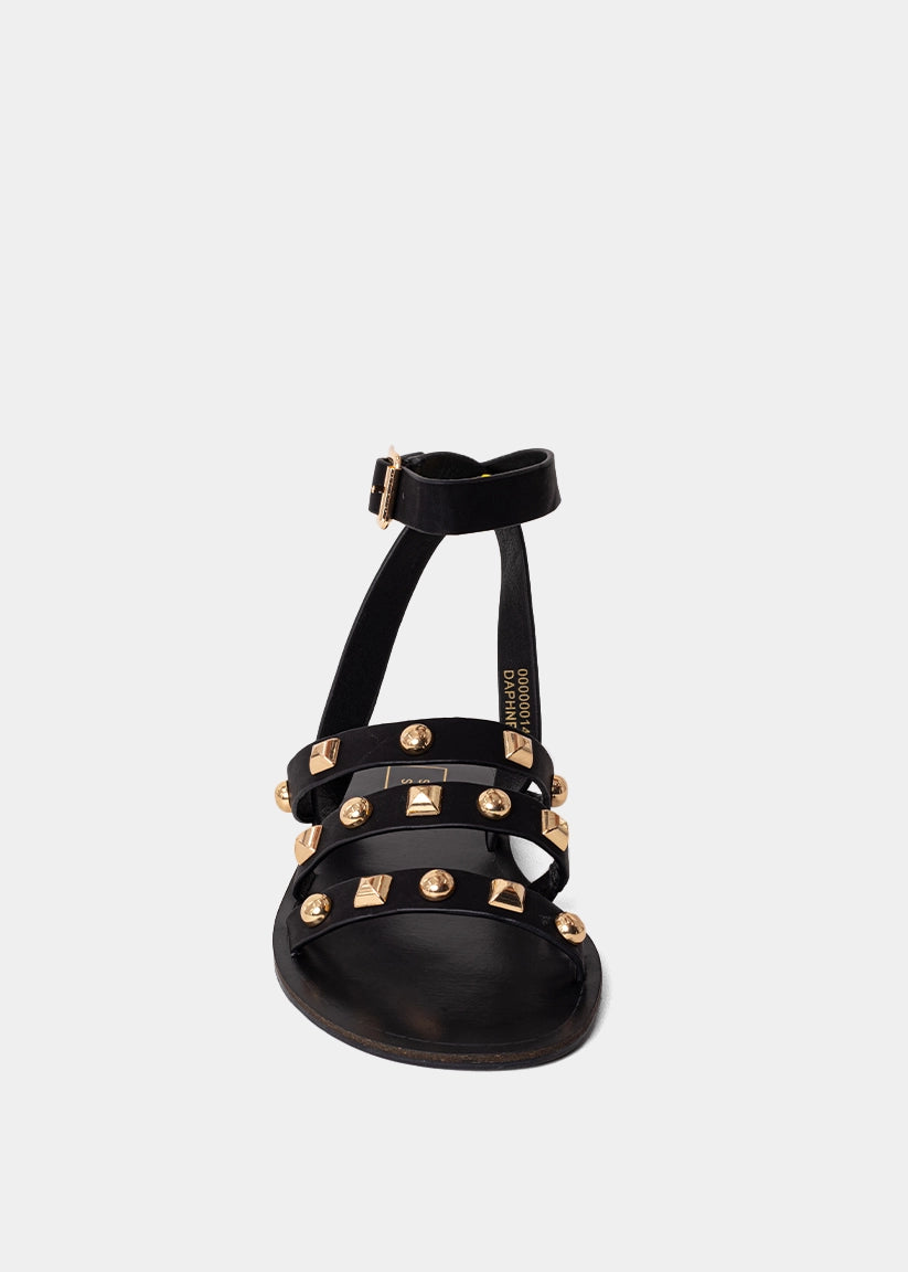 Minimal lines. Maximum impact. The DAPHNE in Black is your go-to gladiator-inspired flat sandal with an edgy, elevated twist. Featuring bold gold-tone studs and an adjustable ankle strap, this sleek faux leather sandal adds effortless attitude to everyday looks. Wear it with everything from linen sets to summer dresses for a polished finish with just the right edge. A flat that feels far from basic.