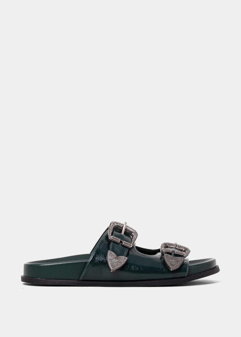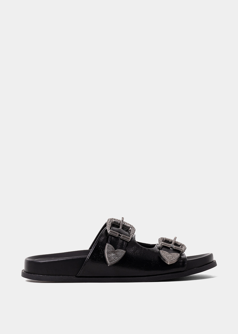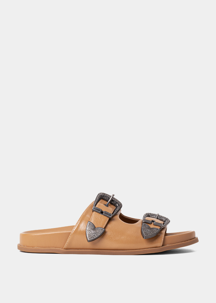 DOLLY in Bone is the slide sandal your summer wardrobe didn't know it needed. Designed with an elevated shine and topped with bold heart-shaped metal buckles, it strikes the perfect balance between romantic and edgy. The neutral hue makes it endlessly versatile, from linen sets to wide-leg denim; this sandal easily pulls everything together