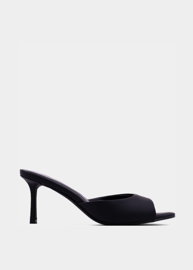 Bold, sleek, and always in style, the ELAINE heeled sandal in black faux leather is the definition of classic glamour. With a sculpted stiletto heel and a retro peep-toe design, this versatile sandal transitions seamlessly from power dressing to an evening out. A must-have for a chic, modern wardrobe.