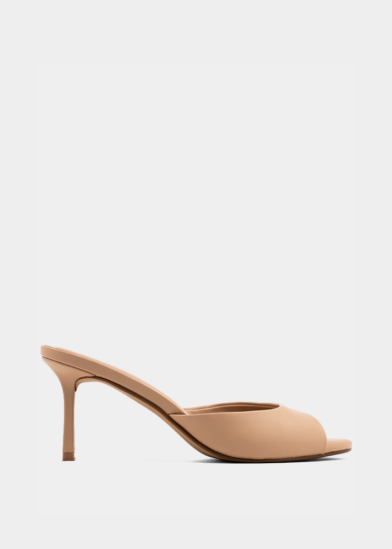 Timeless and effortlessly chic, the ELAINE heeled sandal in nude faux leather is a wardrobe essential. With its sleek stiletto heel and retro-inspired peep-toe design, this sandal adds a polished touch to any look. Its soft neutral tone makes it a perfect match for everything from date-night dresses to tailored separates.