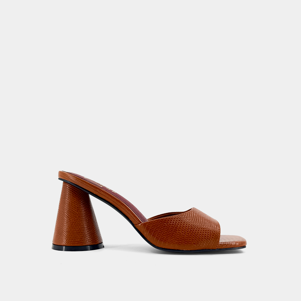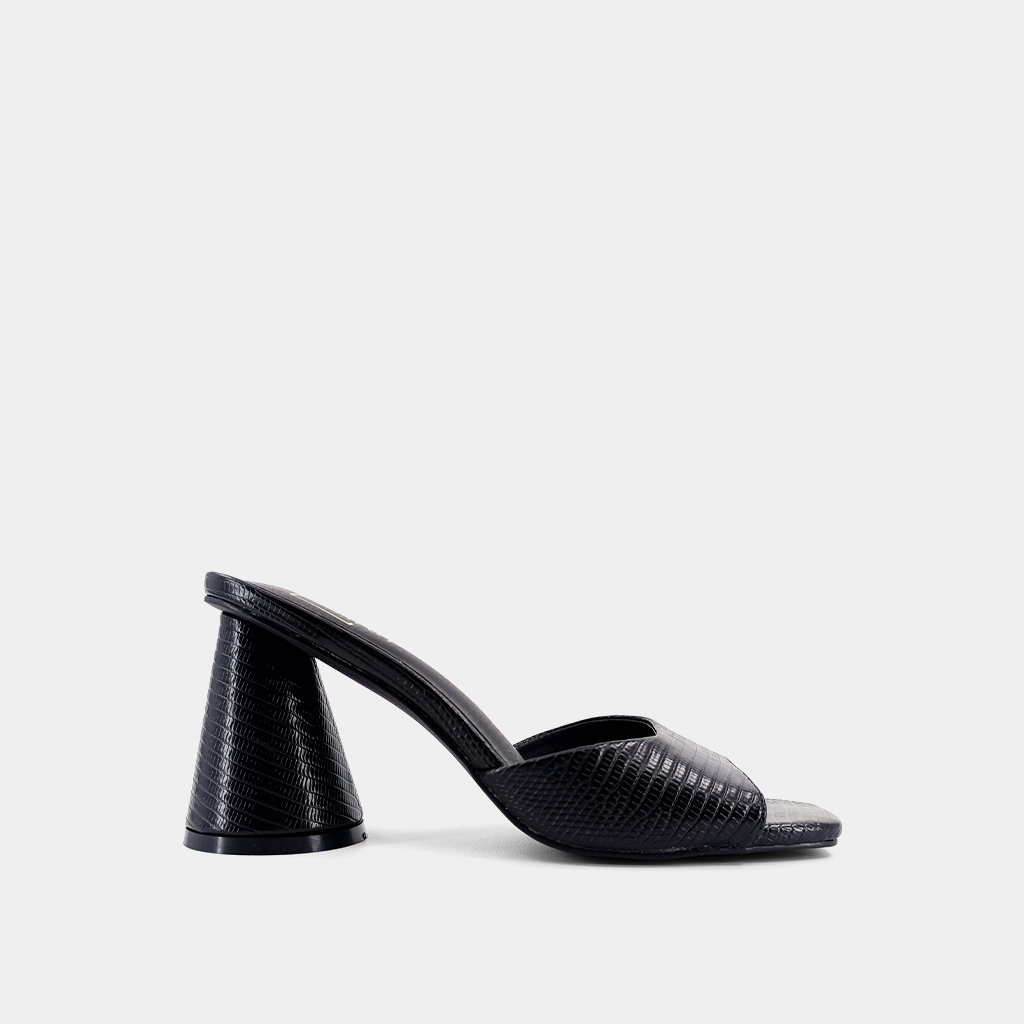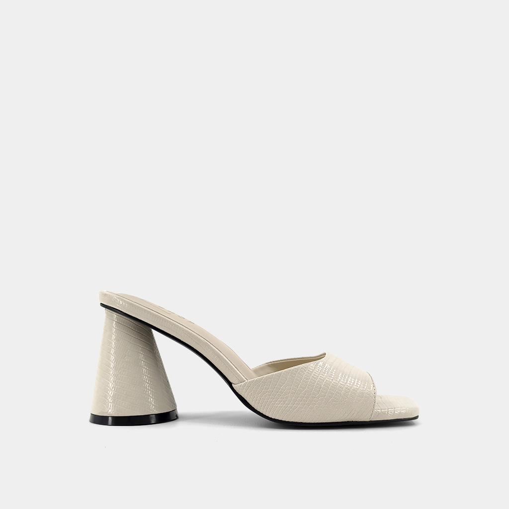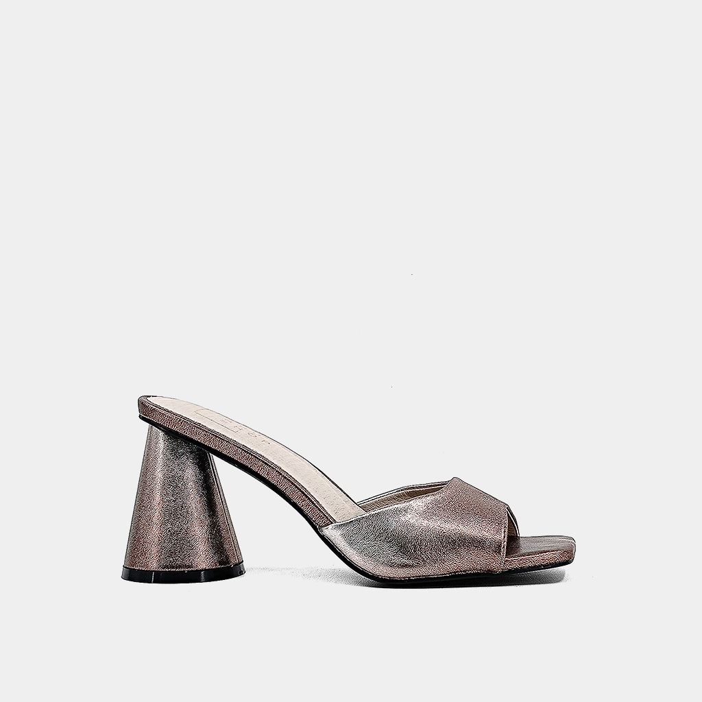 Inspired by '90s heeled mules, ENYA is updated with a comfortable round chunky heel and a pretty straightforward design crafted from faux exotic metallic leather. Versatile, comfortable, yet, elegant for days and nights.