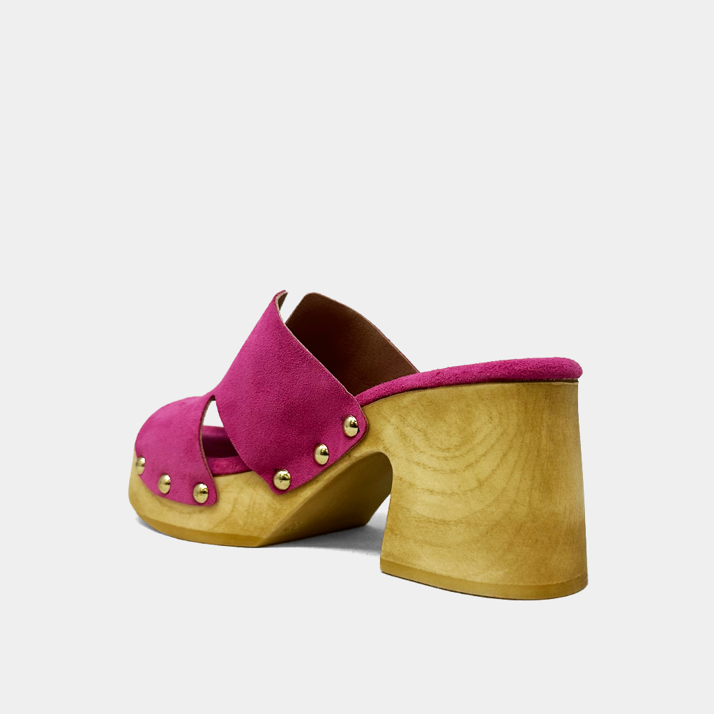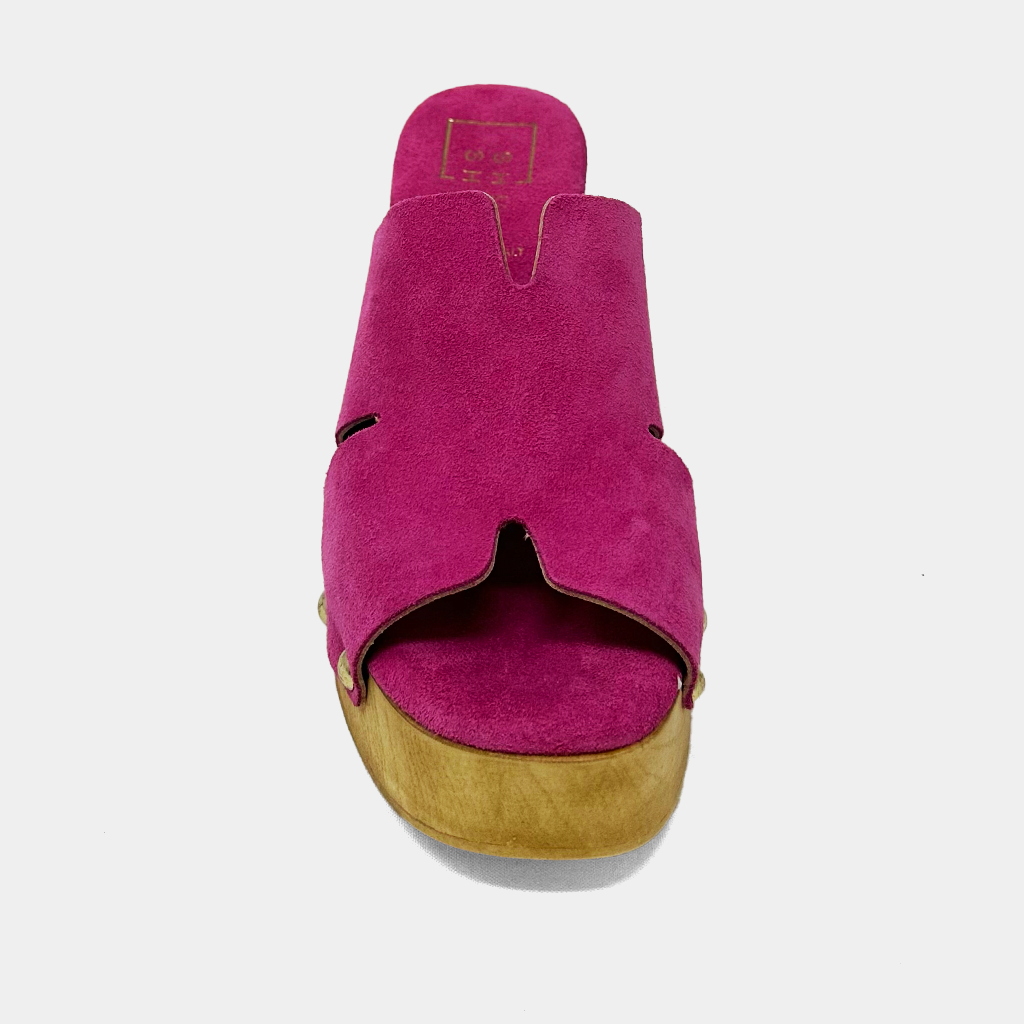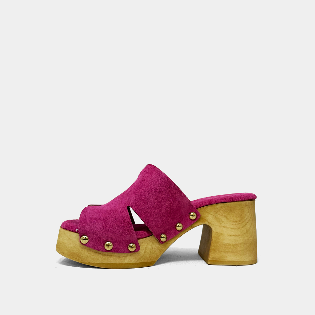 Make a bold entrance with the FLORENCE clog sandal in vibrant fuchsia suede. Designed for those who love a pop of color, this Italian-crafted beauty boasts a sculpted wooden sole, gold-tone studs, and a retro-inspired silhouette. The geometric cutouts add an edgy flair, while the cushioned footbed ensures all-day wearability. Pair it with neutral tones or mix and match for a playful, fashion-forward look.