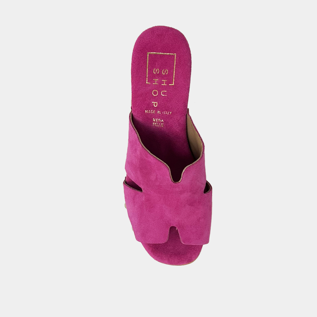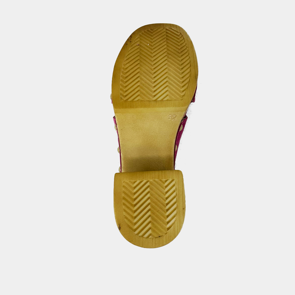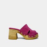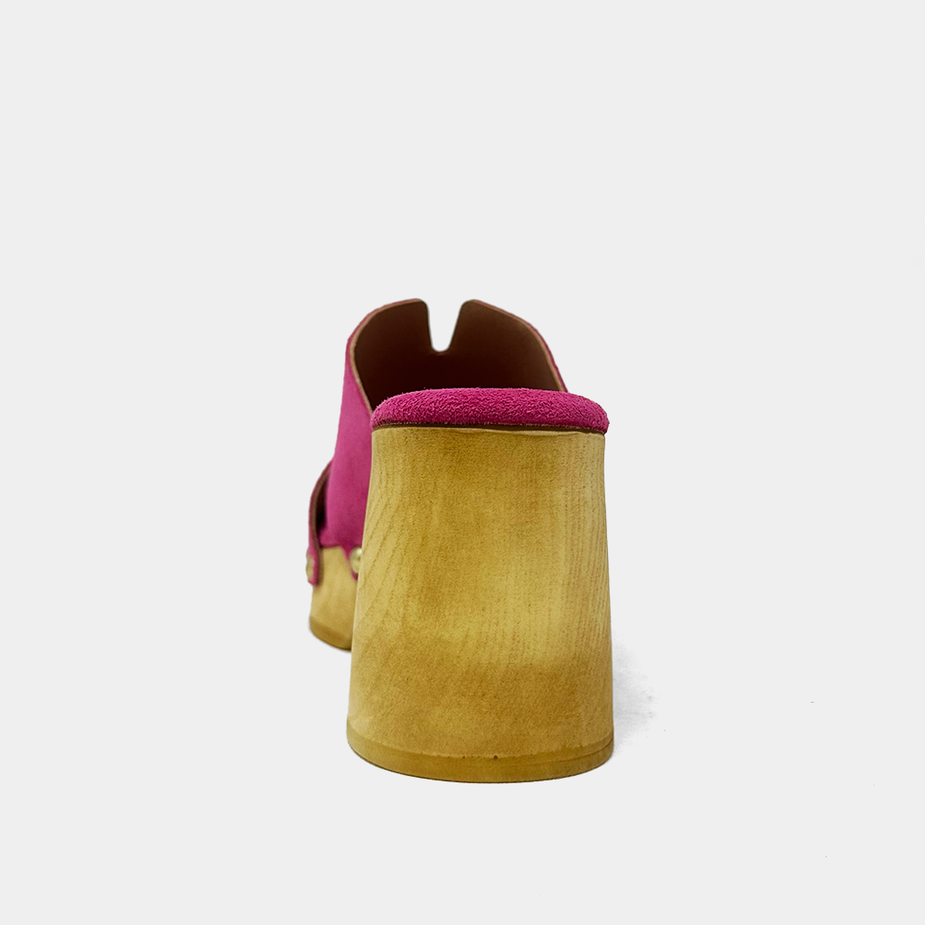 Make a bold entrance with the FLORENCE clog sandal in vibrant fuchsia suede. Designed for those who love a pop of color, this Italian-crafted beauty boasts a sculpted wooden sole, gold-tone studs, and a retro-inspired silhouette. The geometric cutouts add an edgy flair, while the cushioned footbed ensures all-day wearability. Pair it with neutral tones or mix and match for a playful, fashion-forward look.
