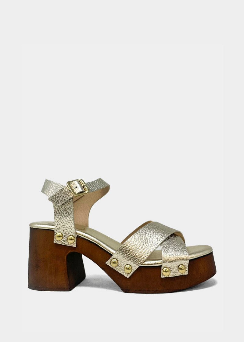 Step into retro glam with the GIOVANNA sandal in metallic gold. Crafted in Italy from genuine materials, this platform heel brings '70s-inspired sophistication with its sculptural wooden sole and crisscross leather straps. Gold-tone rivet accents add a bold edge, while the ankle strap ensures a secure fit. A statement piece that transitions effortlessly from day to night.