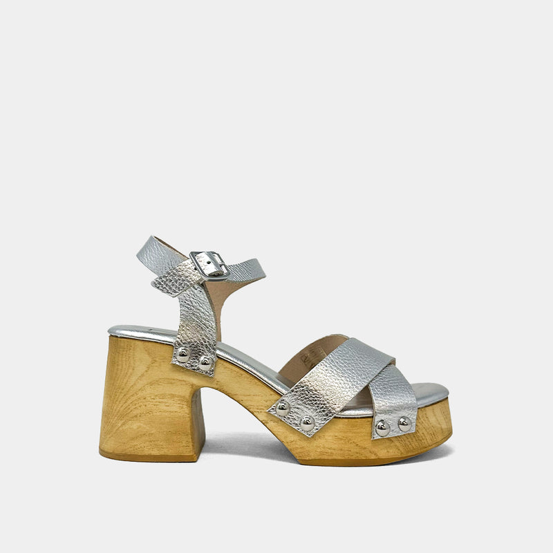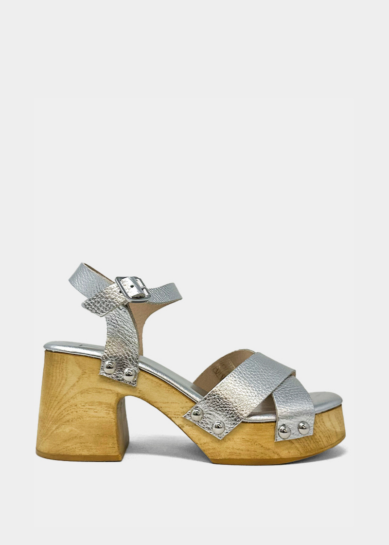 Timeless meets trendy with the GIOVANNA sandal in shimmering silver. Handmade in Italy with real leather, this vintage-inspired platform is set on a sculpted wooden sole, balancing height with comfort. Silver-tone studs and a sleek ankle strap complete the effortlessly chic look. Perfect for adding a metallic touch to your wardrobe.