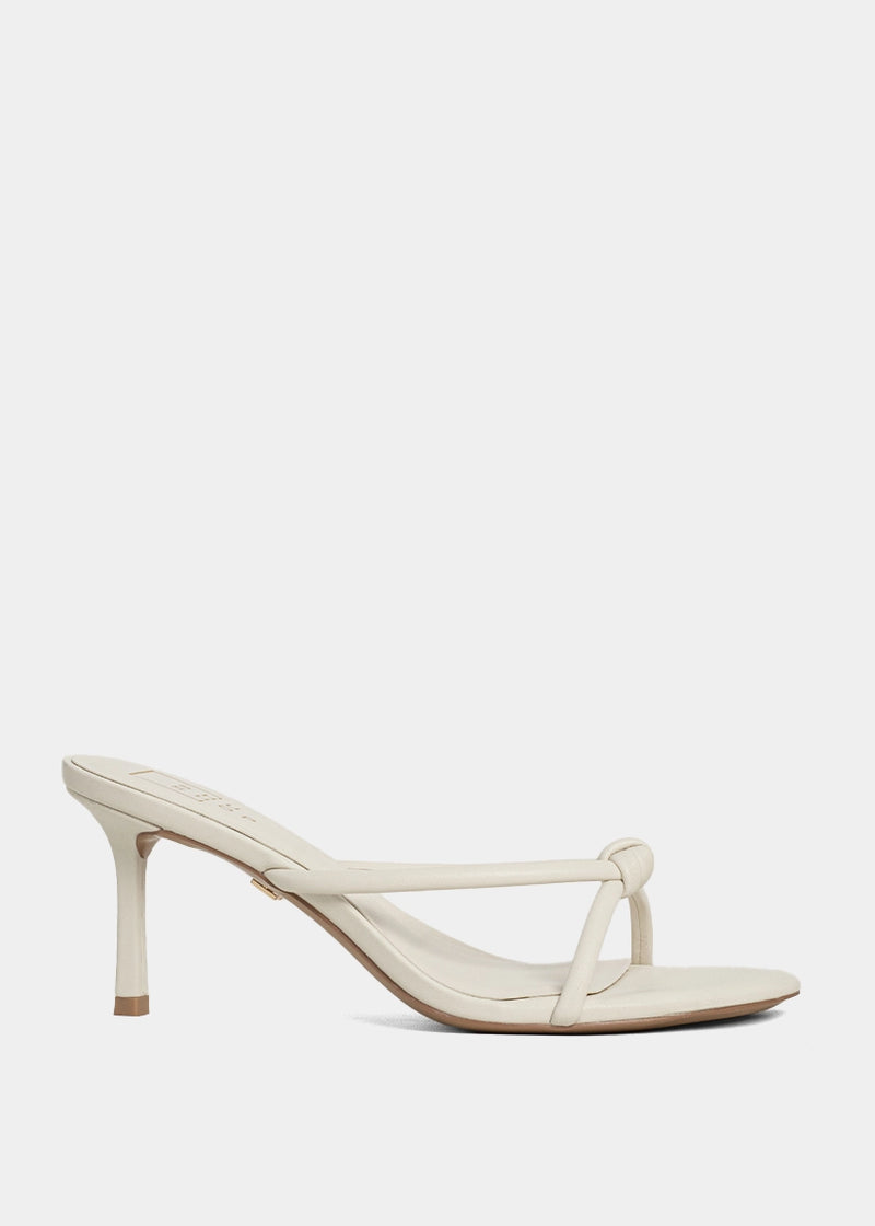 Timeless with a twist. Heidi White reinvents the classic thong sandal with a sleek kitten heel and softly knotted straps in a clean white hue. Feminine, minimal, and effortlessly cool-this is your new go-to for sunny days and warm nights.