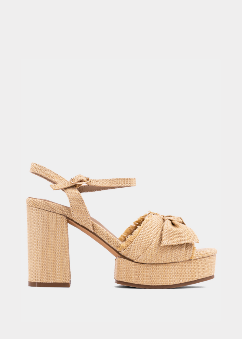 Timeless and effortlessly chic, the HOLLYWOOD in Natural brings a fresh, earthy vibe to your wardrobe. The woven-texture upper and frayed bow give it a relaxed yet sophisticated feel, while the elevated block heel and platform provide the perfect lift. Designed for comfort and style, this sandal is your warm-weather essential!
