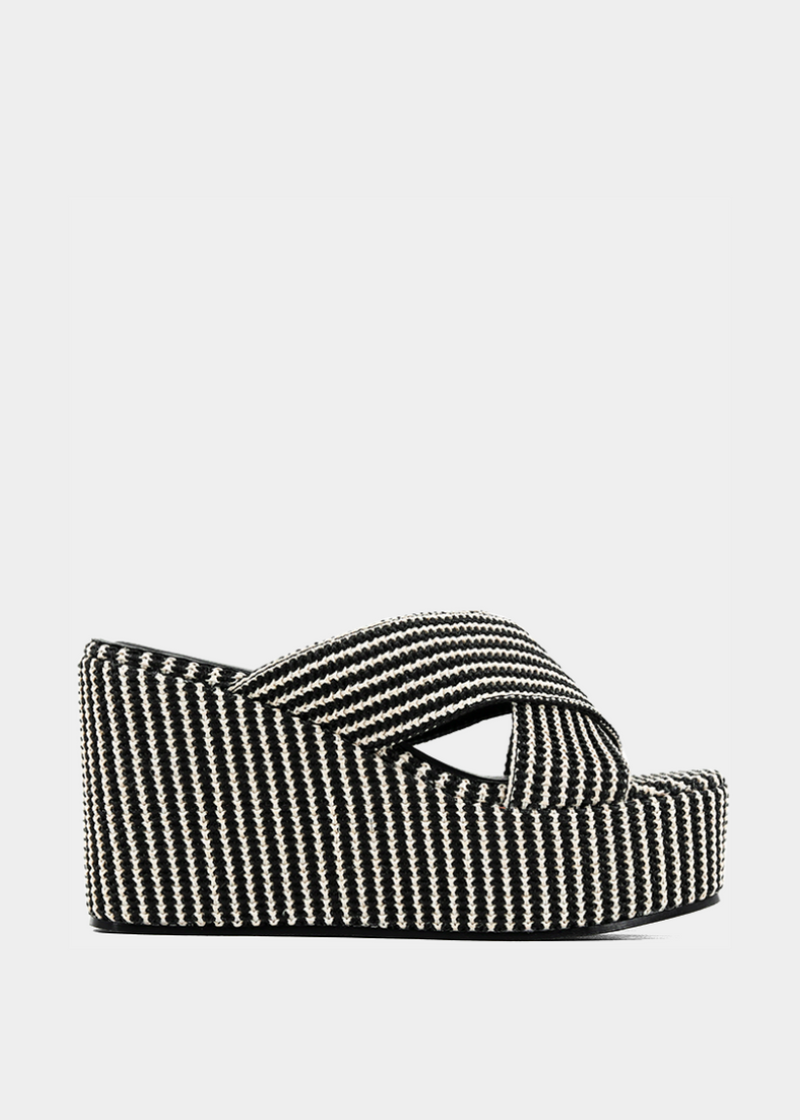 Turn heads in the LUDOVICA platform wedges, crafted from intricately woven raffia in a bold black-and-natural stripe. This sky-high statement shoe blends vintage charm with modern attitude, featuring a dramatic platform sole and wide crossover straps for an effortlessly chic look. Perfect for styling with breezy dresses or wide-leg pants, these wedges are your go-to for a show-stopping summer vibe.