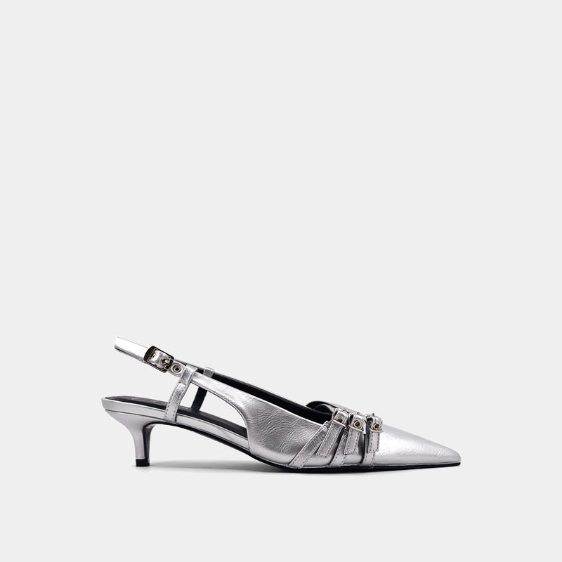 Elevate your style with these stunning heeled shoes featuring front straps and buckle details, a thin heel, and an adjustable buckle back strap. The pointed toe and mixed-scale buckle straps add a touch of edge to these slingbacks, framed with a pointy toe and a kitten heel. Crafted with a synthetic upper, lining, and a comfortable sole for all-day wear.