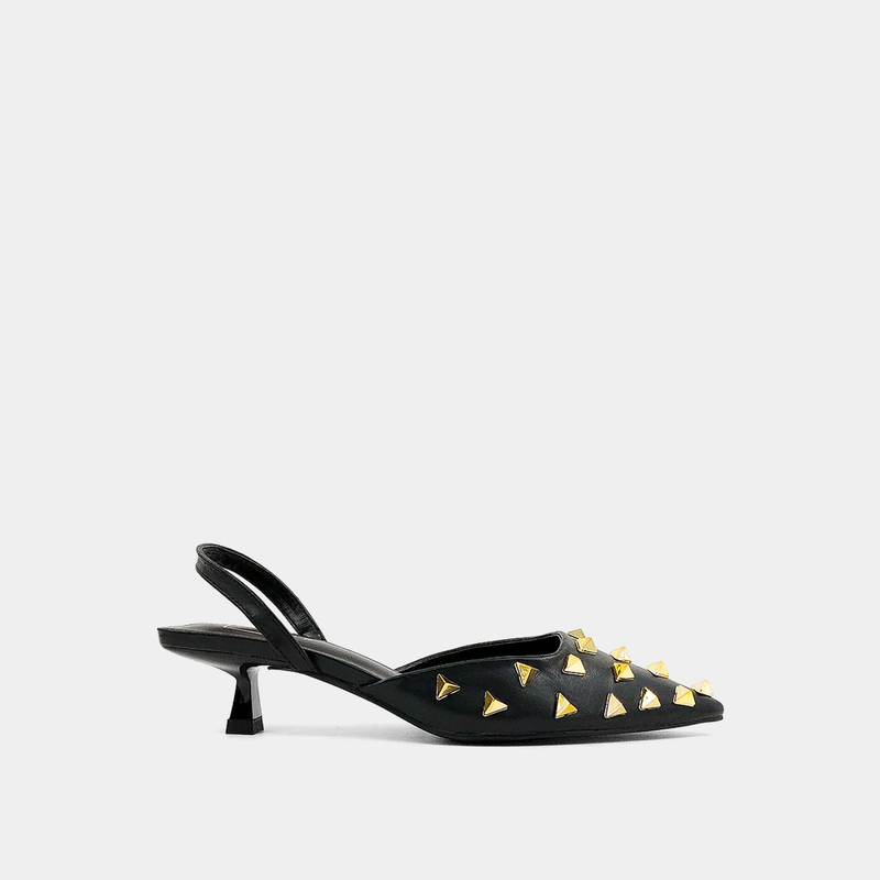 The OCTAVIA pointed closed-toe pumps with elastic slingback straps are made from supple faux leather and showered with golden pyramid studs. The low flared comma heel suits nicely with crisp tailoring.