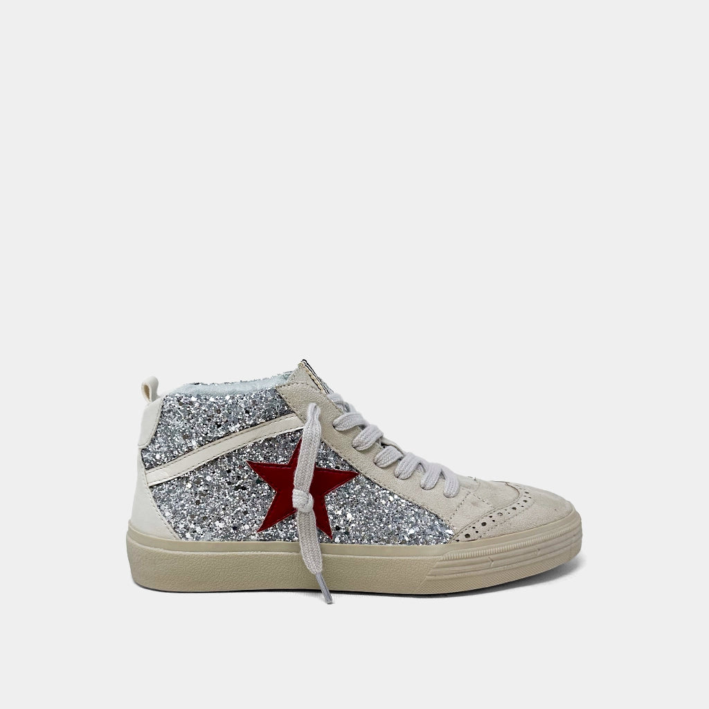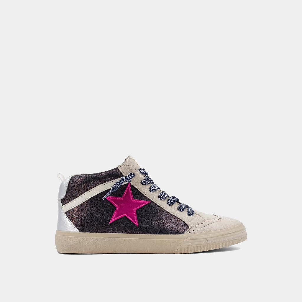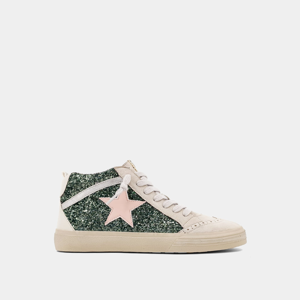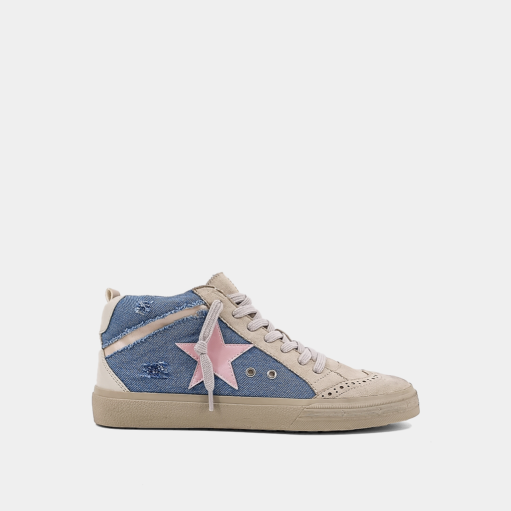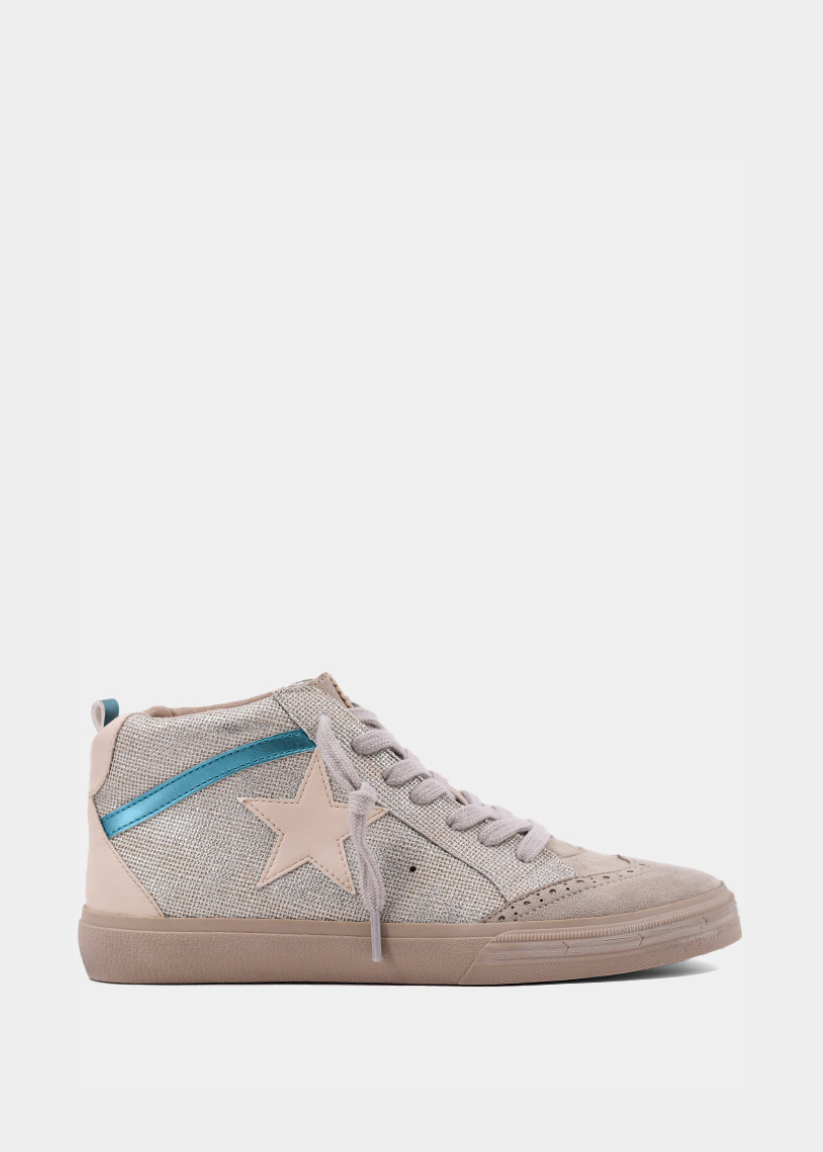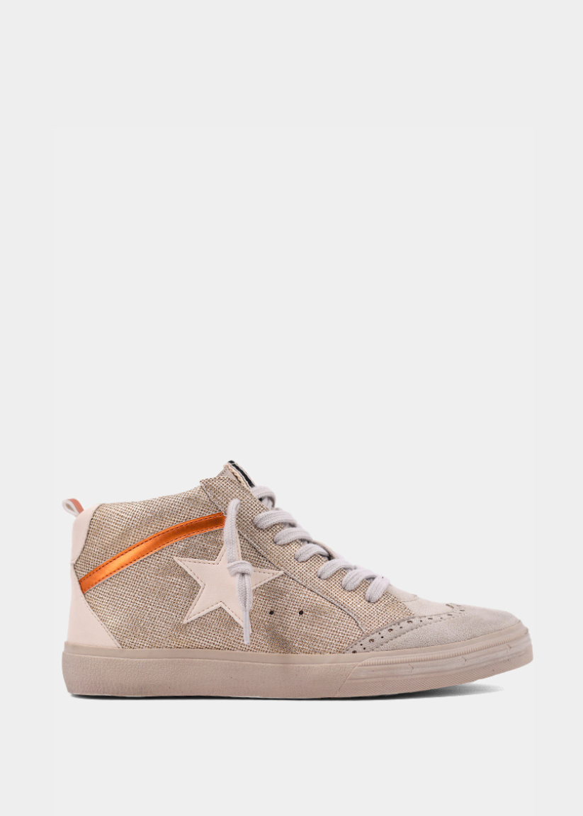 PAULINA dazzles in Champagne Snake with a faux-snakeskin upper that glimmers in soft champagne tones, radiating effortless elegance. Beige suede overlays add a grounding touch of warmth, while creamy faux-leather accents on the ankle and side stripe keep it sleek. The star pops in a muted blush pink faux-leather, adding a playful yet sophisticated contrast. A sturdy rubber sole ensures comfort and durability, making this statement pair your go-to for everyday glam