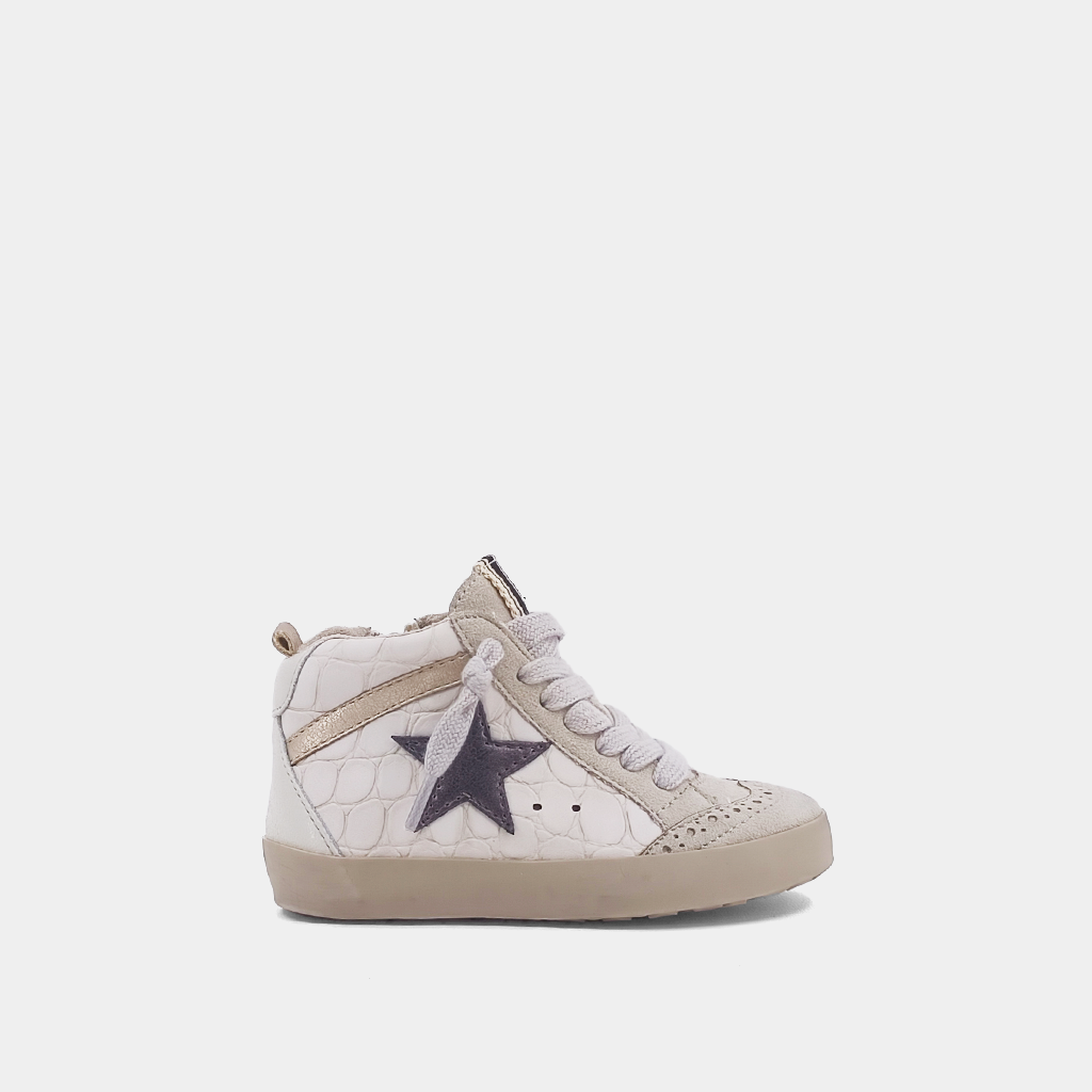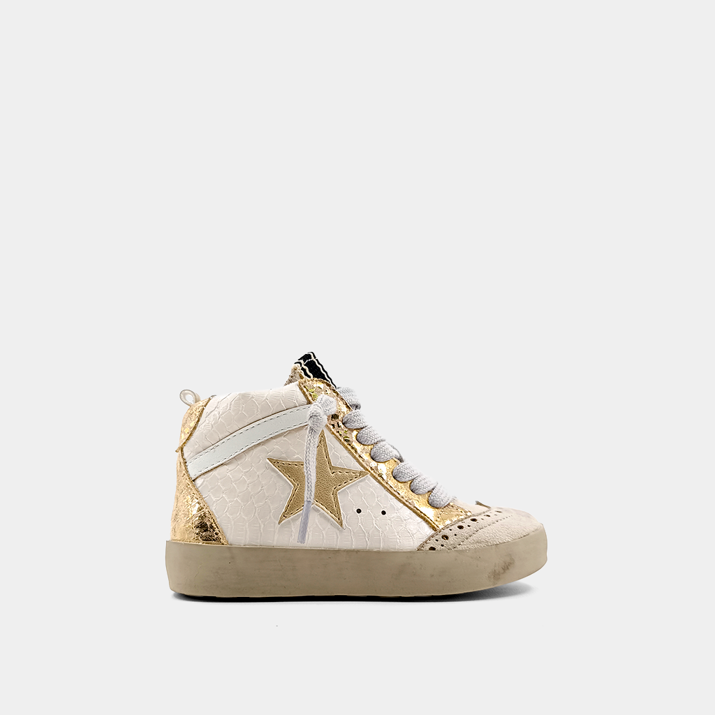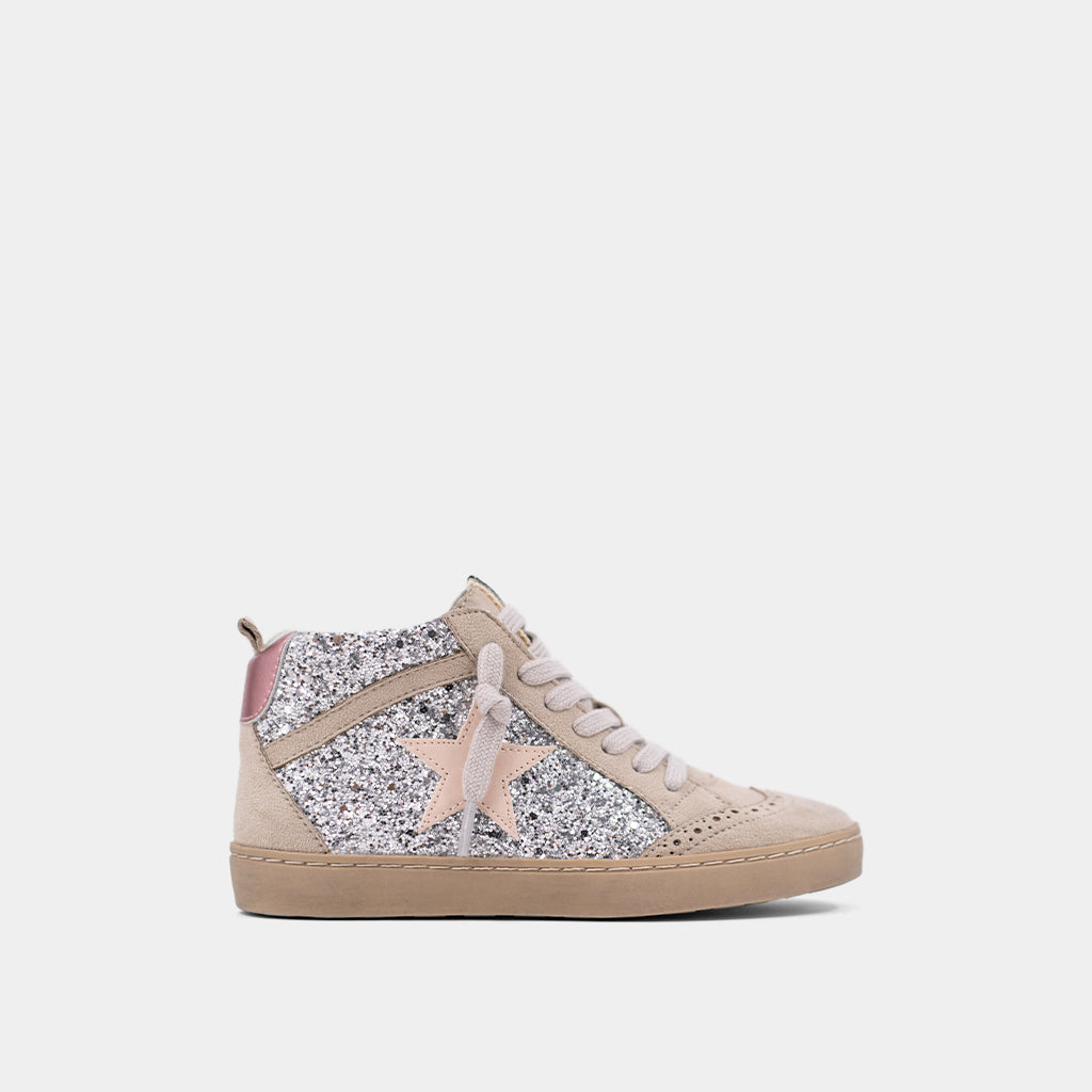 For the little trendsetter who loves to sparkle and move. The PAULINA MINI in Champagne Snake is a stylish mid-top sneaker designed for playful fashion moments. With its shimmering faux snakeskin upper, metallic pink star patch, and soft beige suede trim, it’s made to stand out while staying comfy. A side zipper makes it easy to slip on and go-perfect for busy mornings or last-minute adventures.