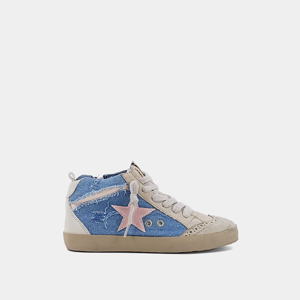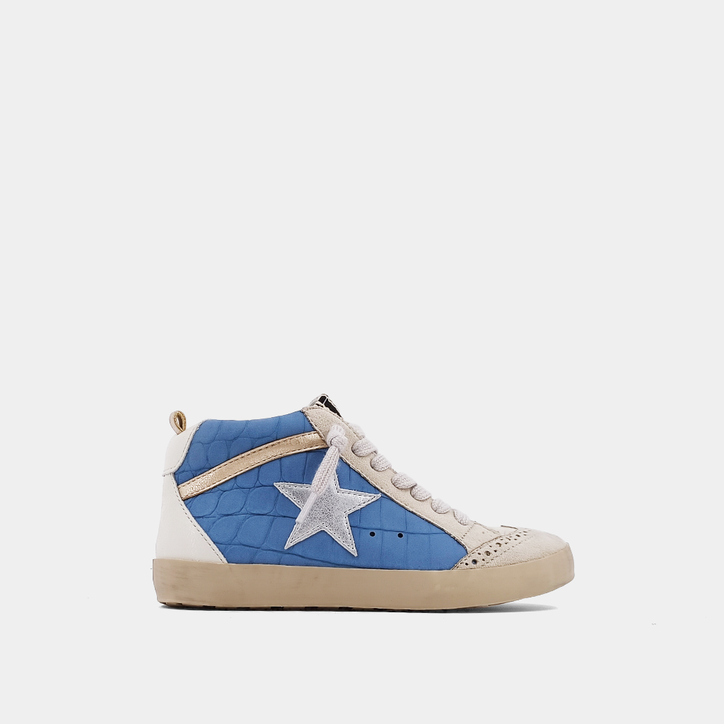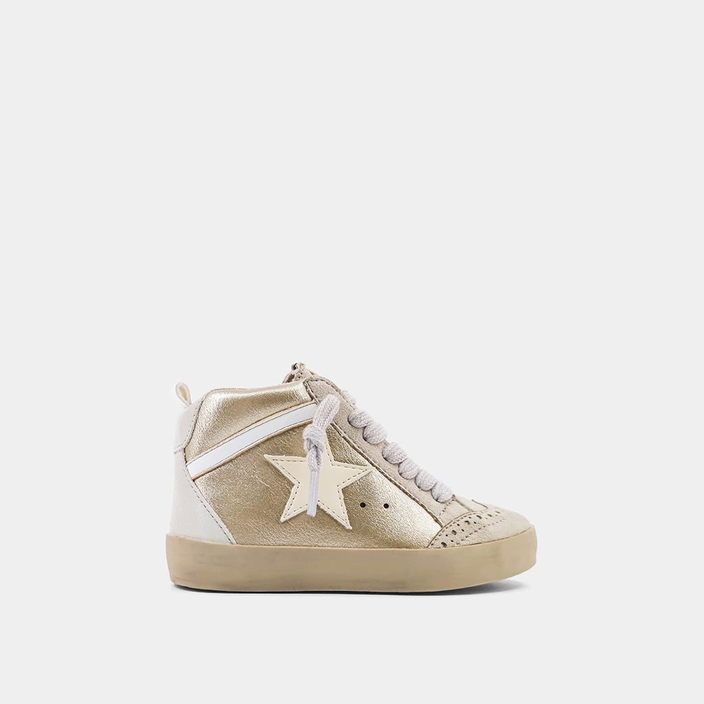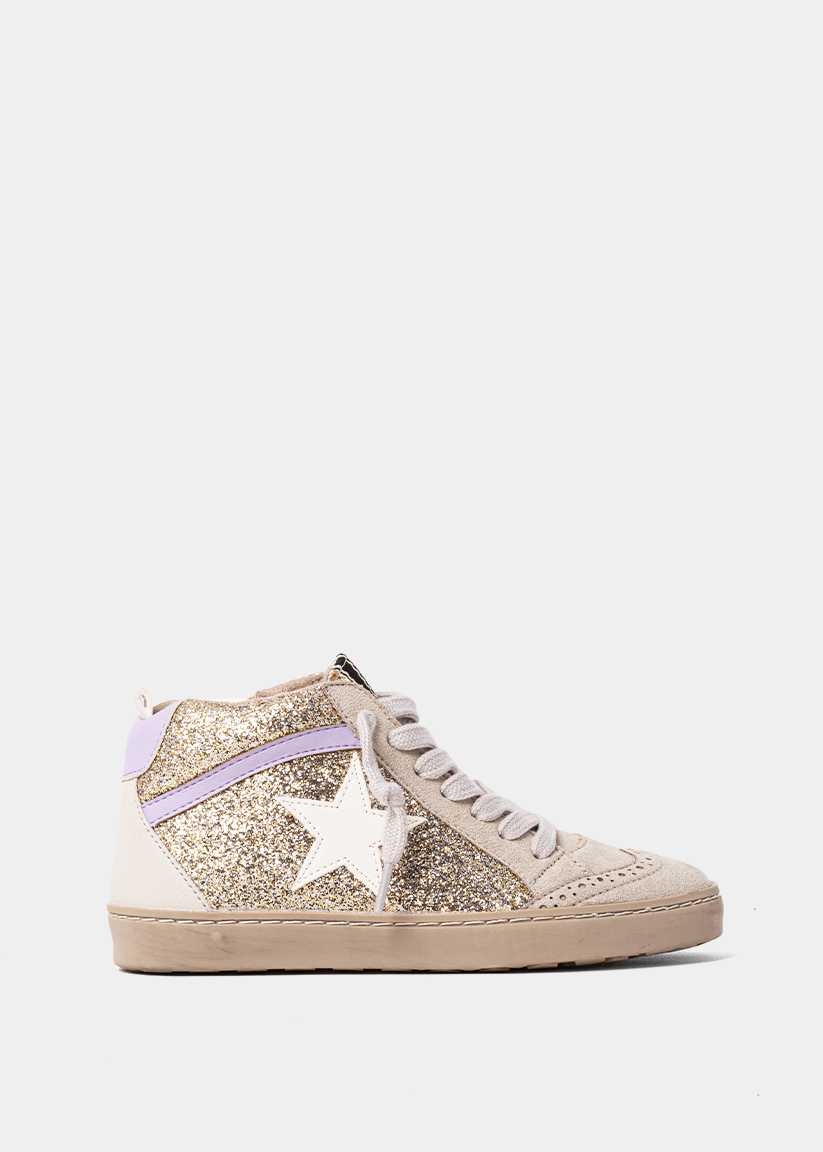 For the little trendsetter who loves to sparkle and move. The PAULINA MINI in Champagne Snake is a stylish mid-top sneaker designed for playful fashion moments. With its shimmering faux snakeskin upper, metallic pink star patch, and soft beige suede trim, it’s made to stand out while staying comfy. A side zipper makes it easy to slip on and go-perfect for busy mornings or last-minute adventures.