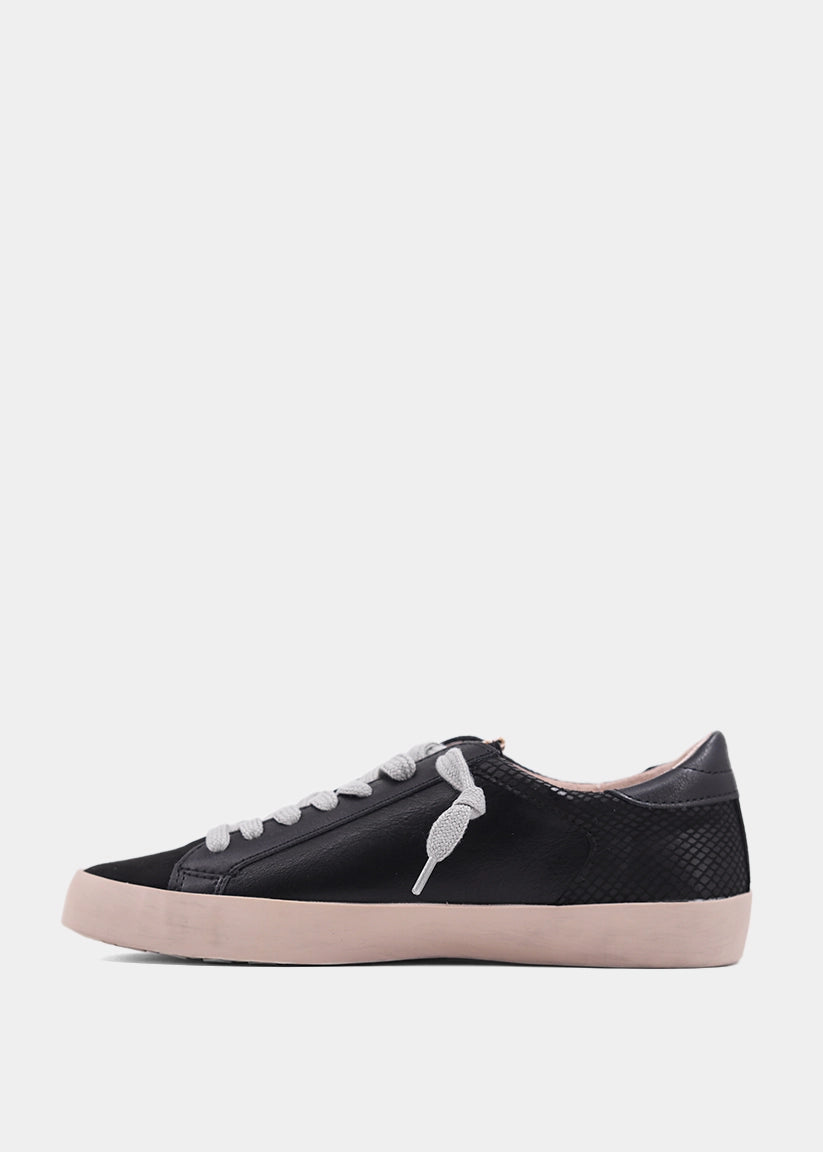 Step up your sneaker game with the REBEL in Black. Crafted with a textured faux snakeskin back and smooth faux leather panels, this pair makes an effortless statement. Finished with a lace-up front, comfy rubber sole, and our signature SHUSHOP gold tag, these sneakers are your new go-to for bold yet wearable looks.