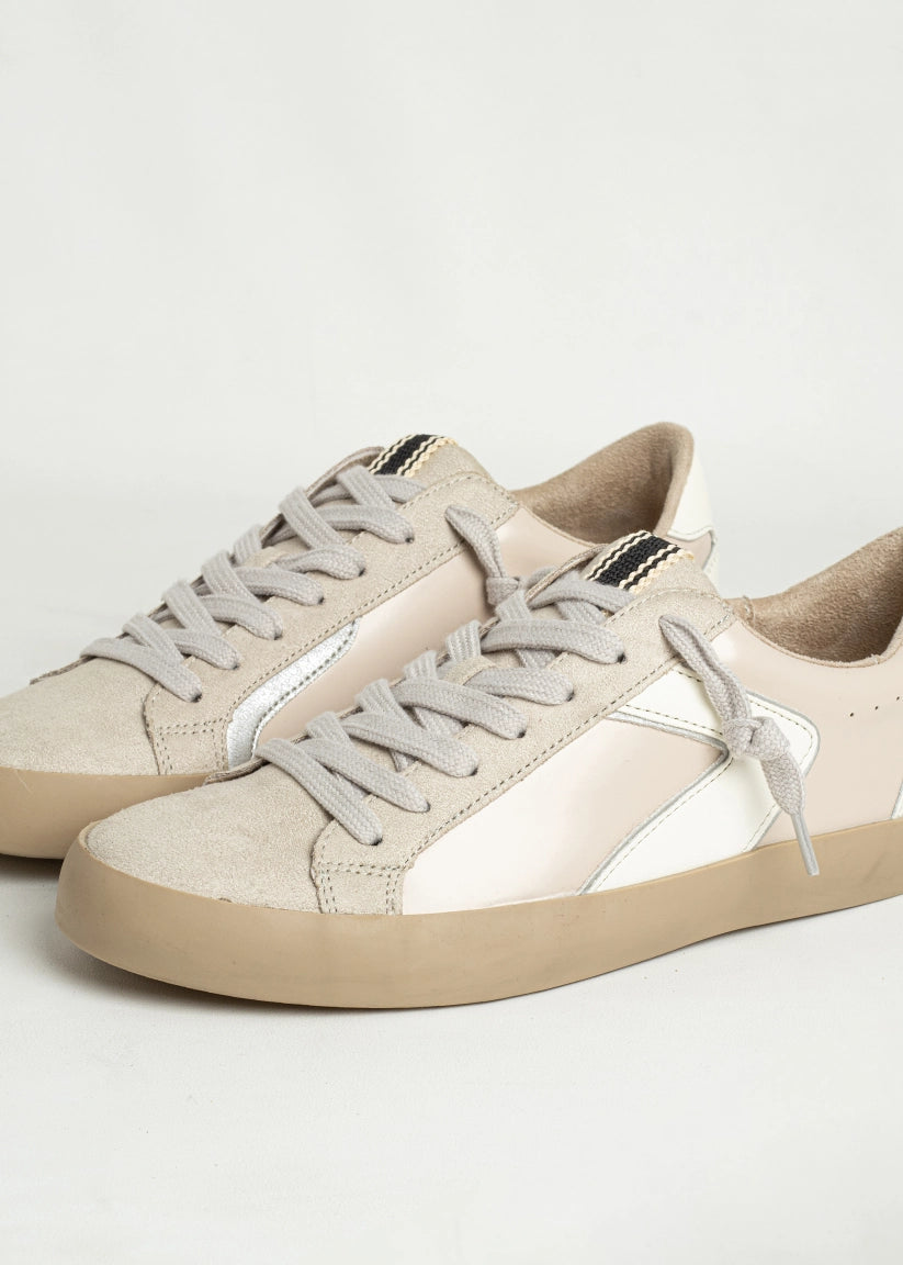 Upper: Faux patent leather with beige tones and faux suede accents