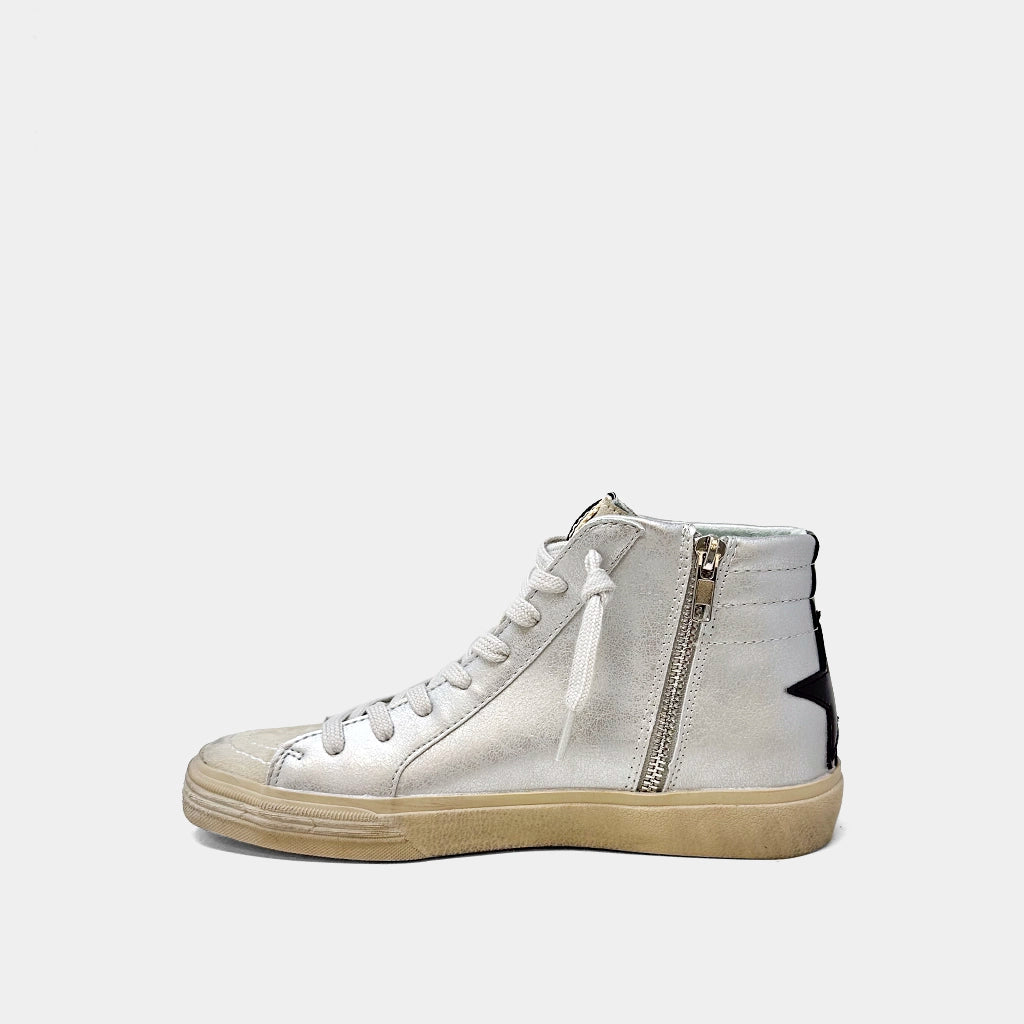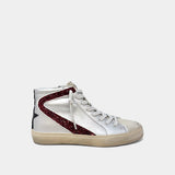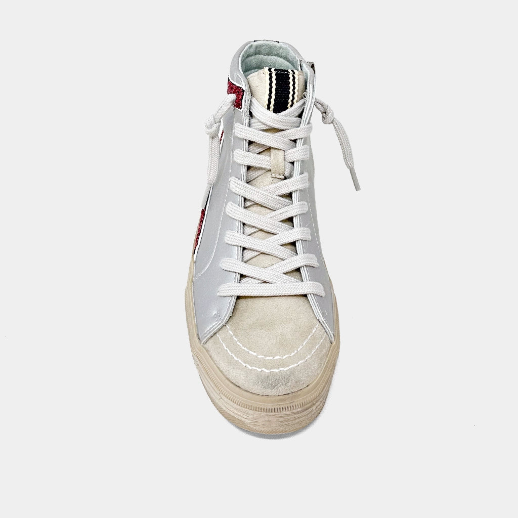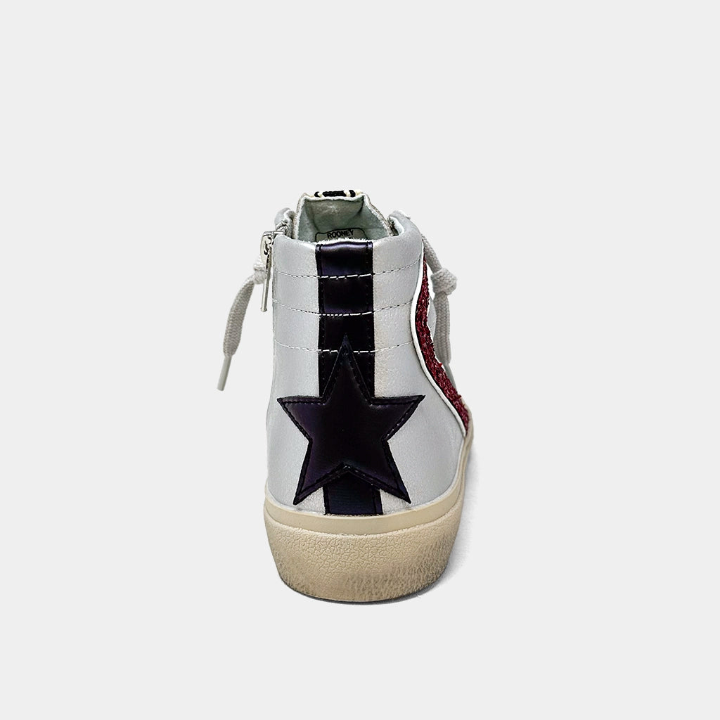 Our ROONEY high-top sneakers pay tribute to classic basketball shoes. They are crafted with metallic faux leather and vibrant glittery accents and offer a comfortable fit. The colorful detailing adds a playful element. These versatile high-tops can be paired with anything from casual skirts to sporty track pants or formal attire, adding a unique touch to any outfit.