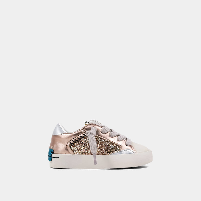 Your children deserve to be as stylish as you! Introducing RUBYthese low-top sneakers are made of textiles, smooth faux leather, and suede combinations. They feature a glittery body and stitching details, with a sleek design and metallic distressed patches for a cool twist. The rubber soles provide long-lasting comfort and support, making them perfect for all-day wear. Timeless appeal and superior craftsmanship.