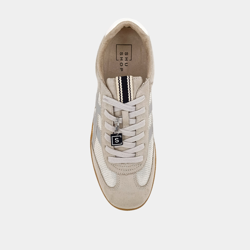 Elevate your style with this chic sneaker, crafted from suede and breathable mesh for a sophisticated yet casual look. The metallic silver faux leather stripes add a sleek, modern touch, making it a versatile choice for any wardrobe. The durable gum rubber sole provides excellent grip and comfort, perfect for all-day wear. Featuring light gray laces and a signature "S" metallic tag, this sneaker combines luxury materials with contemporary design. Step out in style and make a statement with every step.