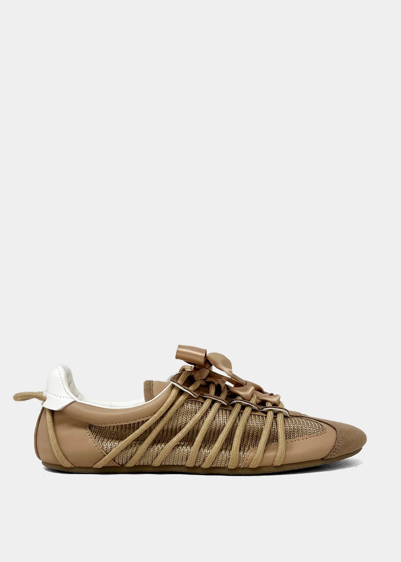 SHERYL in Taupe blends earthy tones with feminine charm in a ballet-meets-sneaker silhouette. Its warm taupe hues, airy mesh upper, and satin ribbon laces make it the perfect style for transitional dressing. Light on your feet, rich in detail, this is effortless sophistication for the everyday muse.