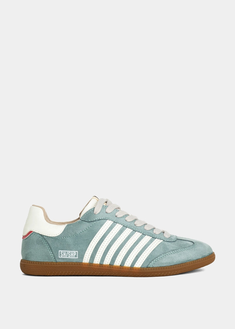 The retro sneaker you didn’t know you needed-until now. STEVIE in Aqua Suede brings a bold pop of teal to your wardrobe with sporty side stripes, a sleek gum sole, and soft suede finish. This vintage-inspired pair is made for off-duty days, casual denim looks, or playful color contrasts. Iconic style, reimagined with a SHUSHOP twist.