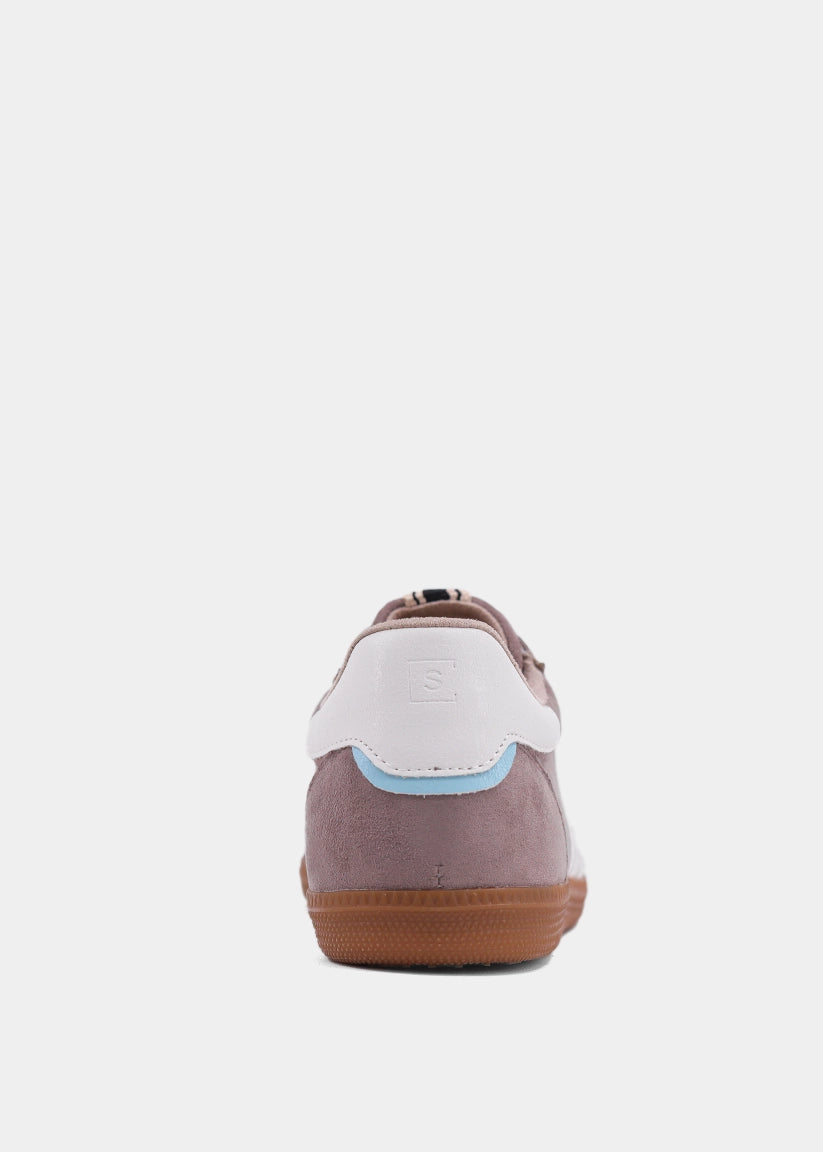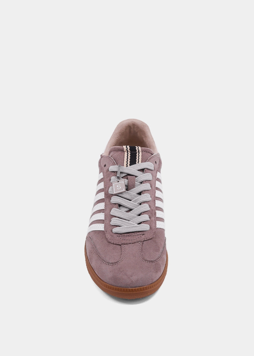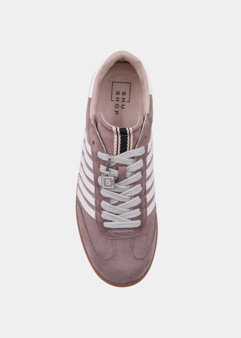 A modern nod to vintage sports styles, the STEVIE in Taupe Suede is built with soft faux suede and features crisp white stitched stripes for a bold, structured look. Finished with a contrast heel tab and a gum rubber sole, it's an easy statement-maker for everyday outfits.