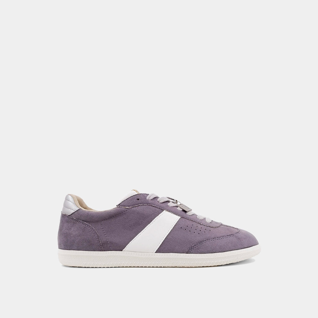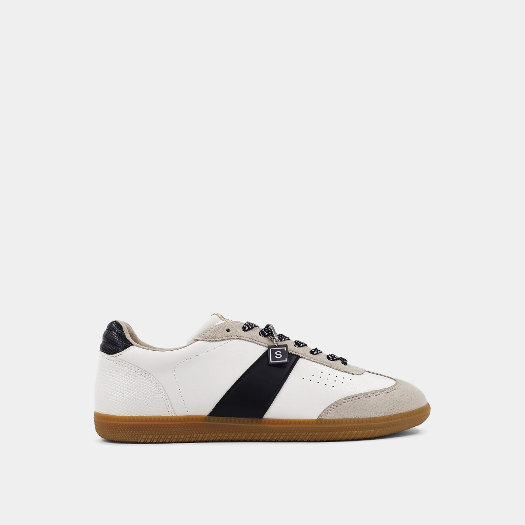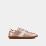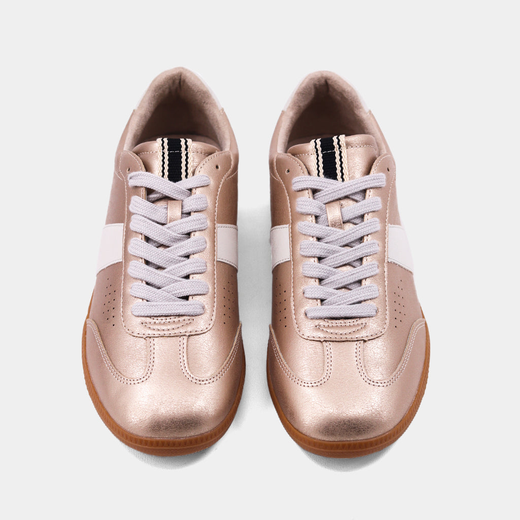 The SYDNEY sneakers shine in buttery faux metallic leather with a striking golden hue. Featuring white-to-bone side stripes and ankle accents, they combine retro style with modern flair. The gum-colored rubber sole ensures comfort, while the signature brand tag pendant adds a luxe touch. A perfect blend of minimalist design and standout style for everyday wear.