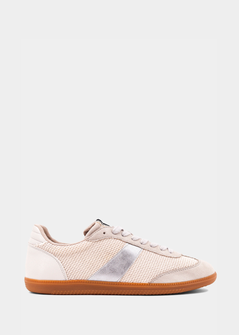 The SYDNEY sneakers are a perfect blend of vintage flair and modern design. These low-top sneakers feature a sleek cream woven body, soft suede overlays, and silver faux leather accents, creating a clean yet stylish aesthetic. The camel-colored rubber soles offer durability and comfort, making them ideal for all-day wear. Complete with the iconic hanging brand tag, the SYDNEY is a must-have for any wardrobe, balancing trend and function.